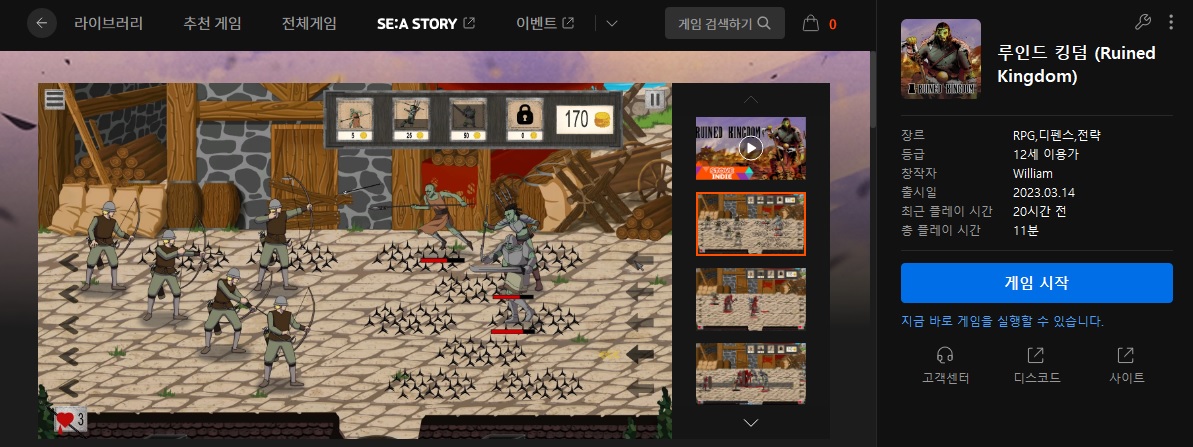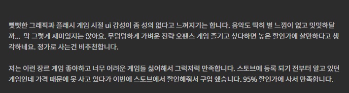 이 개발자의 게임이 3개가 있는데 이 게임이 최신작이에요. 게임 평가에도 썼지만 정가에는 추천하지 않아요. 정가를 좀 낮춰야할텐데 말이죠.