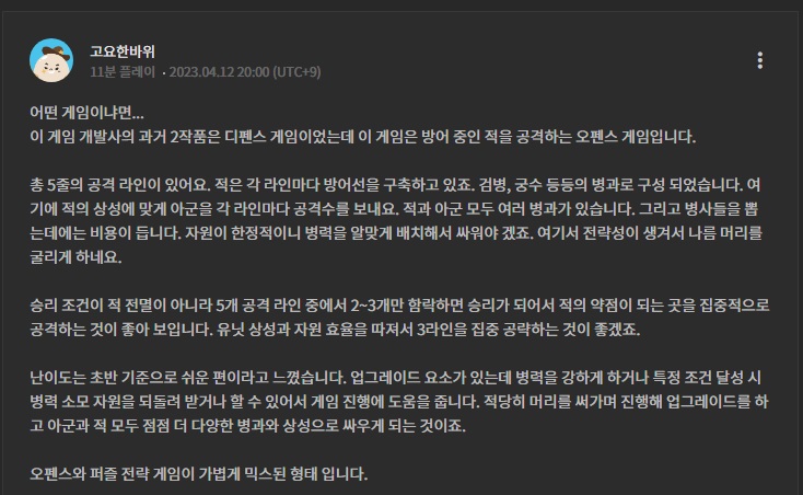 전략성이 좀 있어서 머리를 아주 약간은 써야해요. 한판 한판이 짧기 때문에 짬날 때하면 좋네요.
