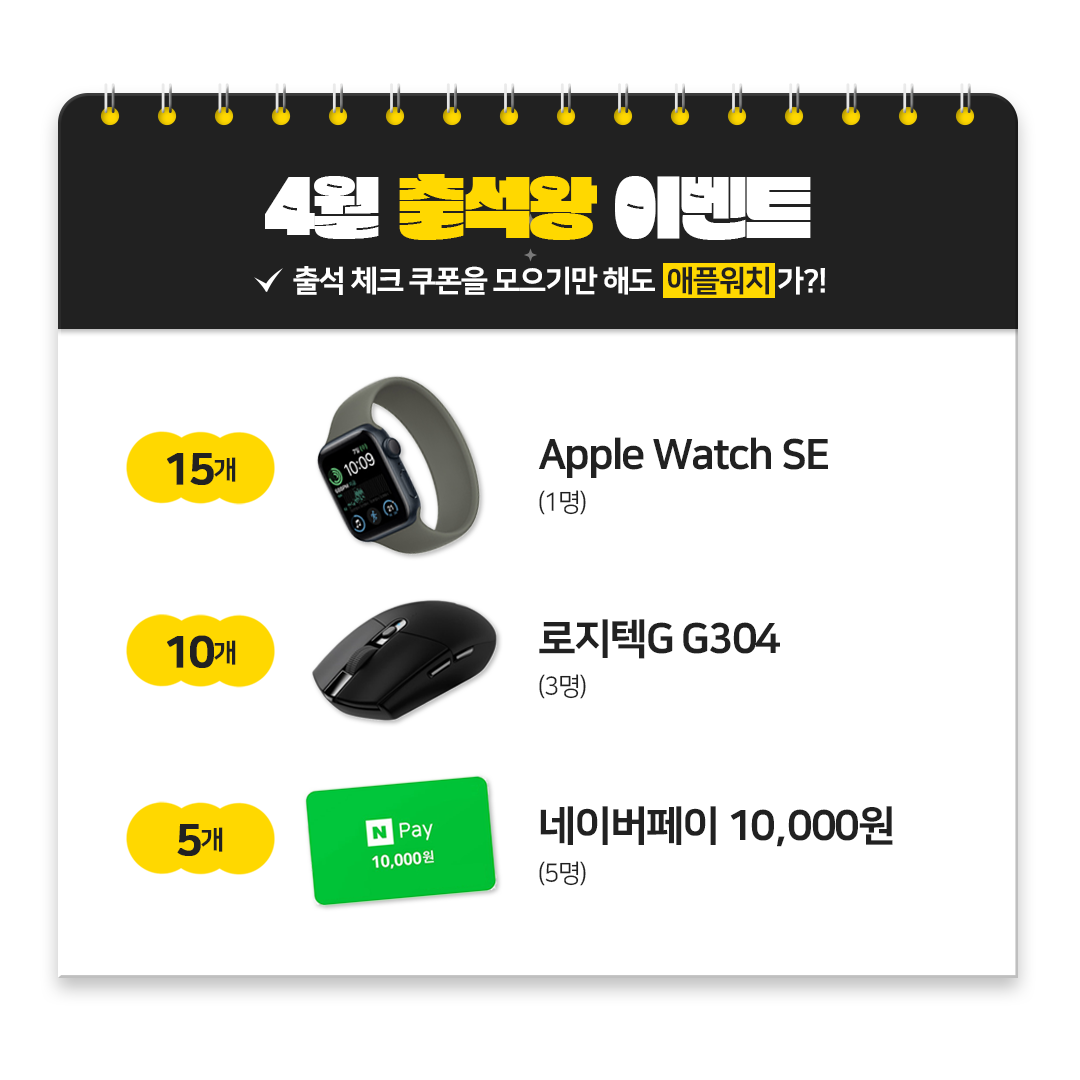 ※ 4/10~4/30까지 다운 받은 "출석 체크 쿠폰"에 한하여 개수가 자동 카운트 됩니다 :)