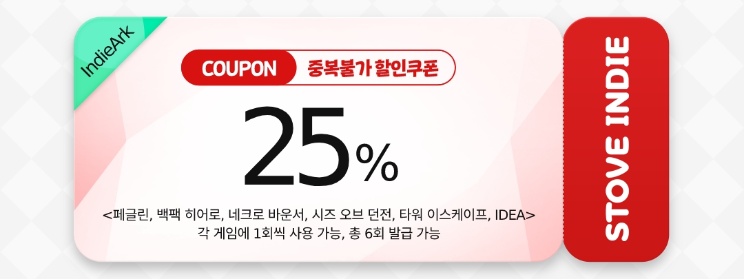 인디아크 인기 컬렉션을 구입하는 것 외에도 보다 저렴하게 인디아크의 게임들을 만날 수 있는 방법이 또 하나 존재합니다. 바로 페글린과 백팩 히어로, 네크로 바운서, 시즈 오브 던전, 타워 이스케이프, 그리고 IDEA까지 인디아크가 배급하는 게임들을 스토브 인디에서 25% 할인된 가격에 구입할 수 있는 쿠폰을 활용할 수 있어요