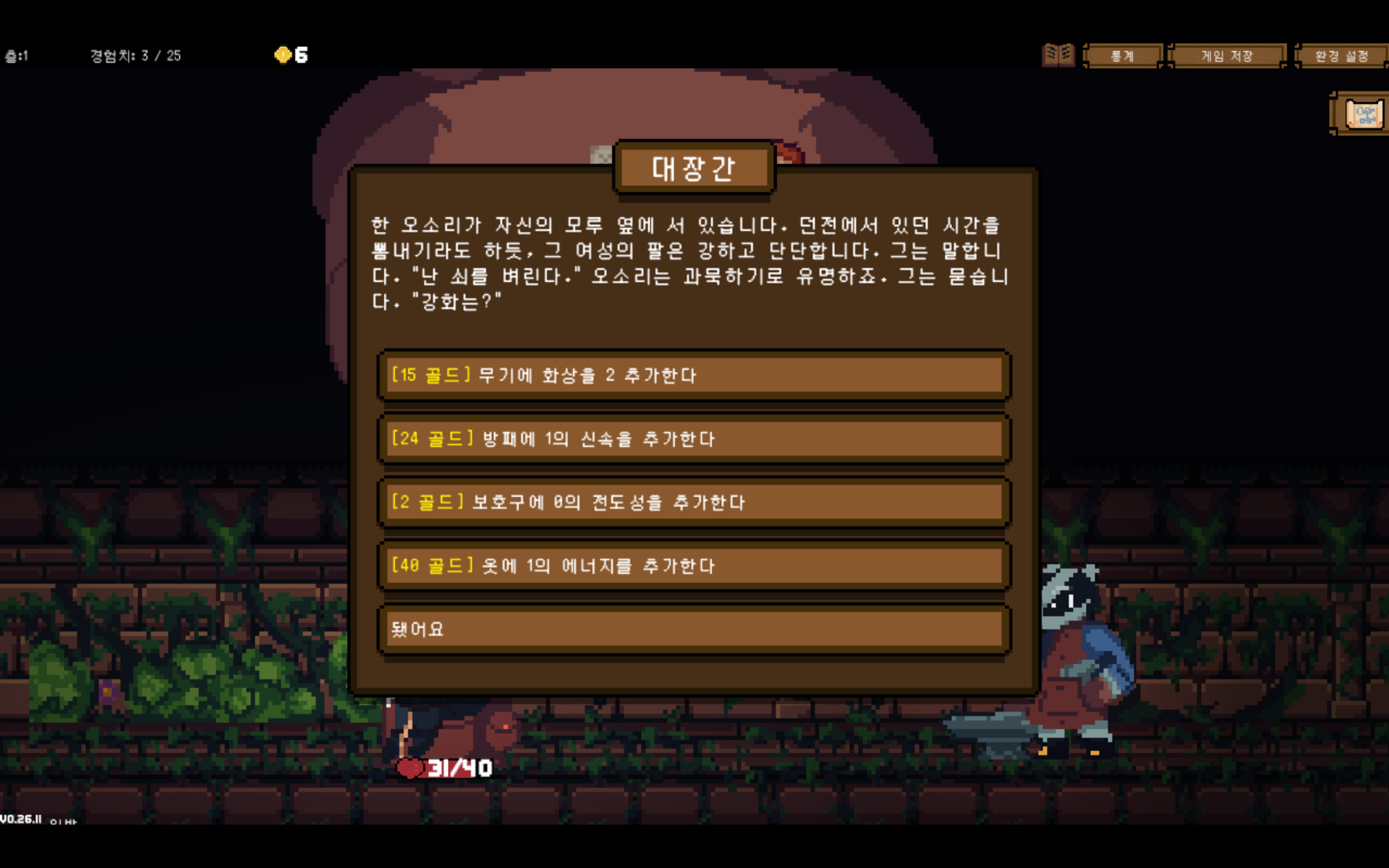 그렇게 열심히 손님들을 처리하다 보면 보스를 만날 수 있고 그 과정에서 유물을 수집하는 것과 스킬을 업그레이드하는 일련의 성장을 거쳐 마지막 엔딩 크레딧에 도달하는 걸 목표로 달려나가게 되죠