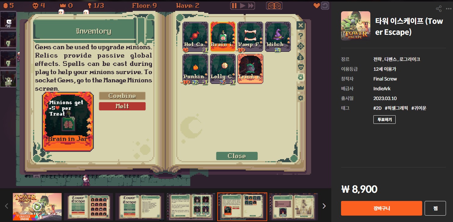 파이널 스크류가 제작하고 인디아크가 배급을 맡고 있는 게임이자 23년 3월부터 스토브 인디에서도 만나볼 수 있게 된 타워 디펜스 로그라이크 게임 타워 이스케이프 역시 색다른 재미를 느낄 수 있는 인디 게임 중 하나입니다