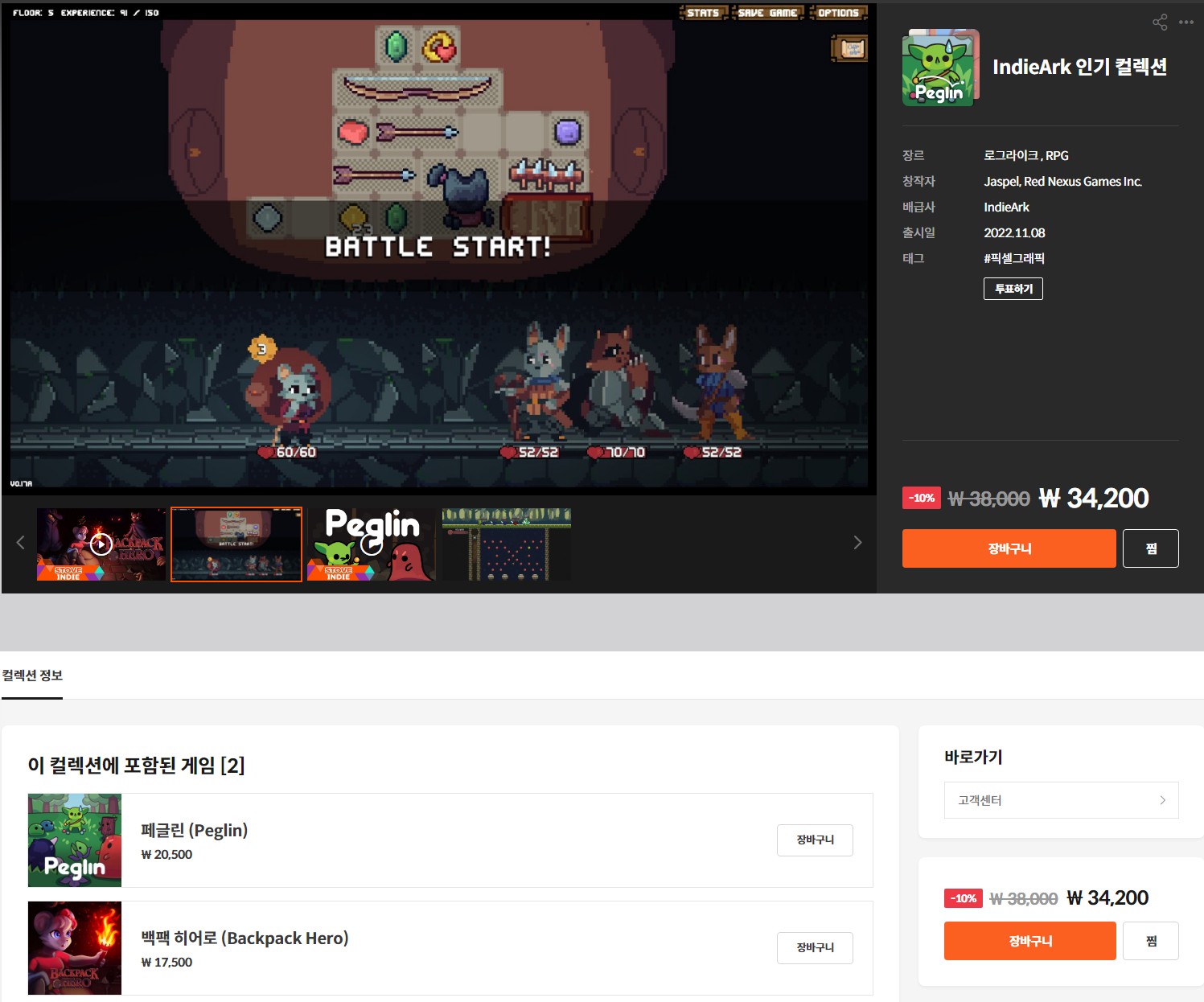 그 중 유저들에게 특히 긍정적인 반응을 얻고 있는 페글린과 백팩 히어로의 경우 아예 2개를 하나로 묶어 조금 더 저렴한 가격에 즐길 수 있도록 인디아크 인기 컬렉션이라는 이름으로 판매 중에 있습니다. 물론 아직 만날 수 없는 게임도 있지만 하나씩 차근차근 들어오고 있는 만큼 언젠가는 인디아크가 배급 중인 모든 게임들을 스토브 인디에서도 만날 수 있을 거예요