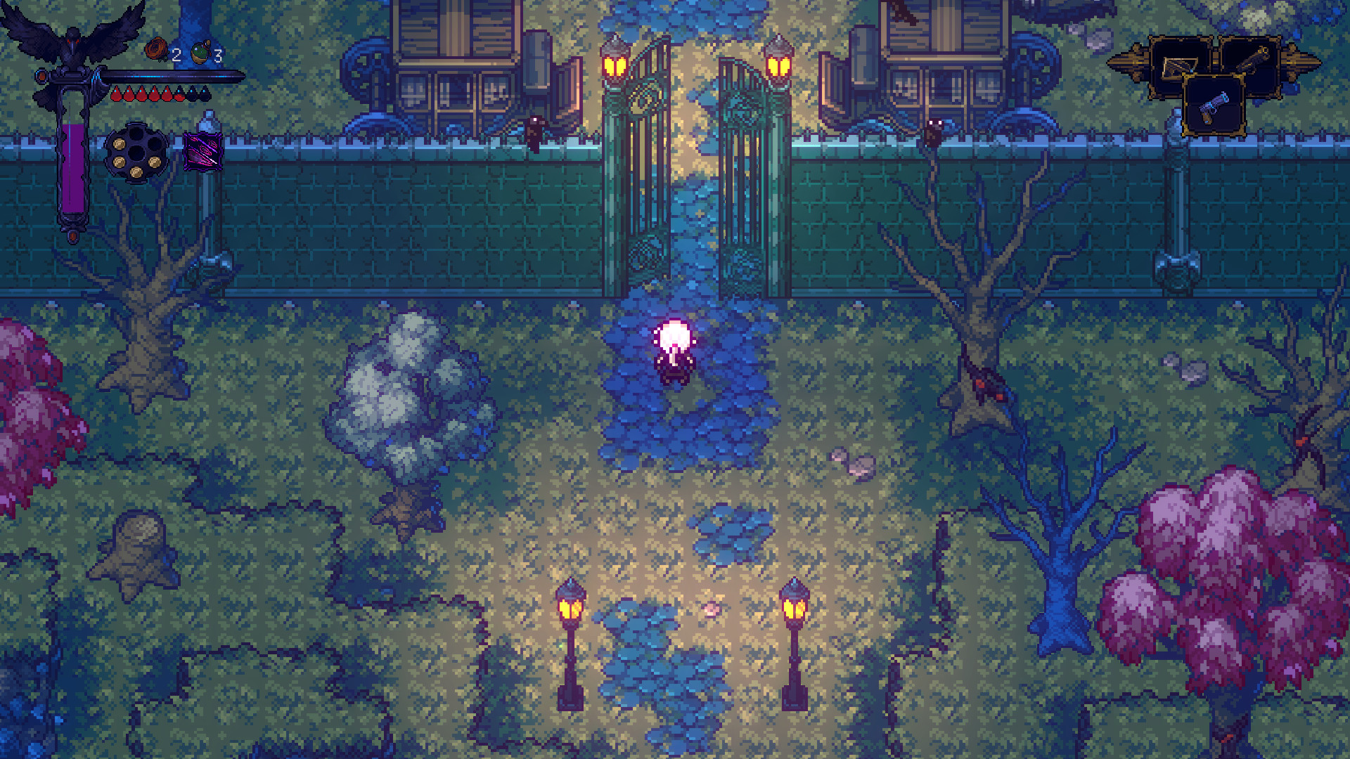 <공동 묘지 근처에 꽃으로 장식된 문이 있습니다.>