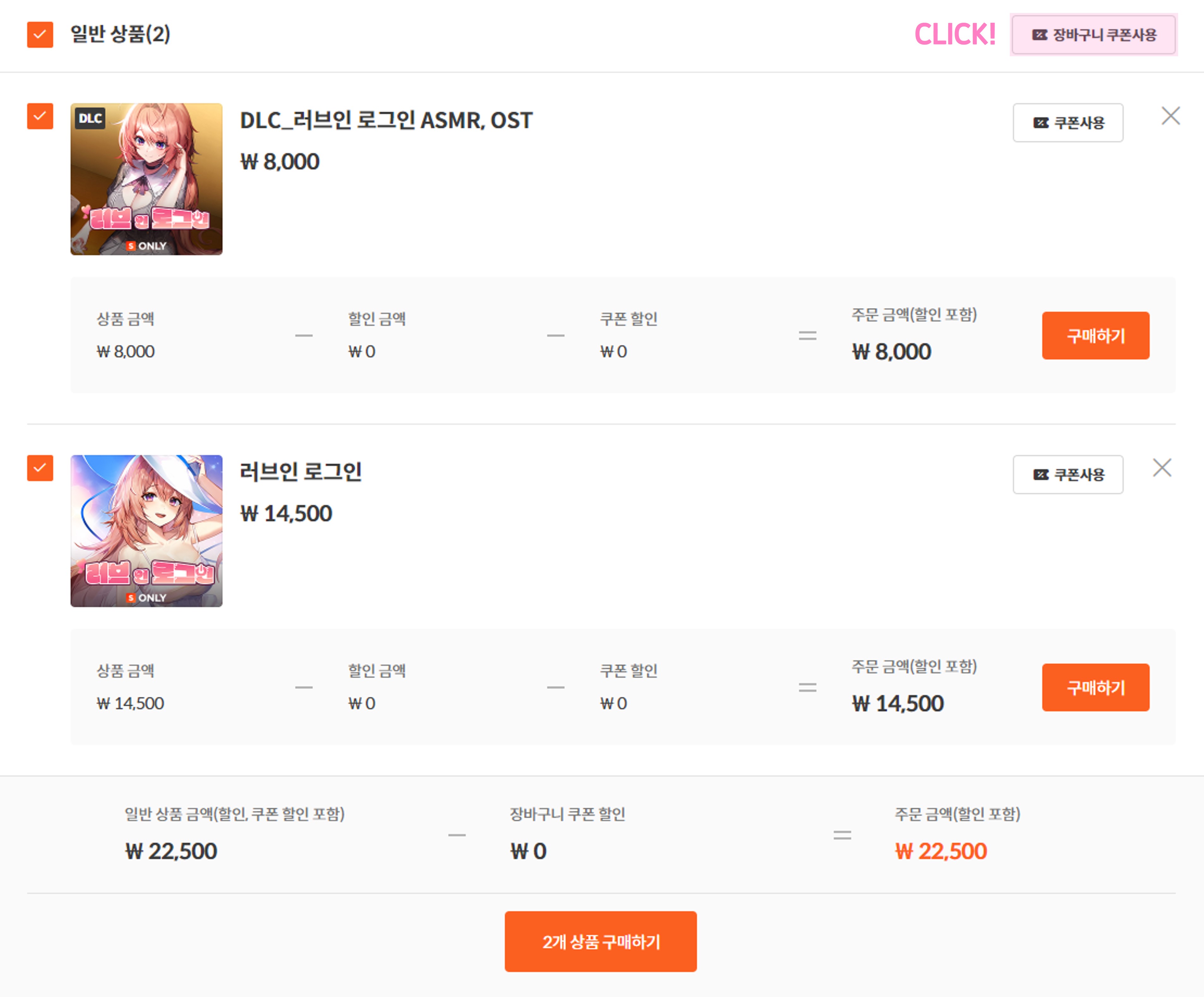 ※ [장바구니 쿠폰 사용] 버튼을 찾을 수 없다면? 하나 이상의 게임을 장바구니에 담아보세요.