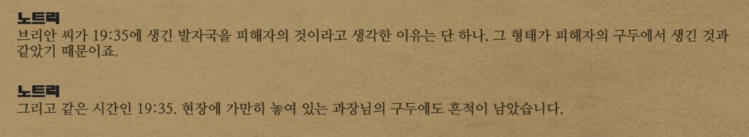 노트릭의 대사중 브리안이 19:35에 발자국을 오해했다고 했지만, 19:35의 발자국은 알 수 없다고 생각하기에, 19:35 -> 20:35 로 고치는게 맞다고 생각합니다.