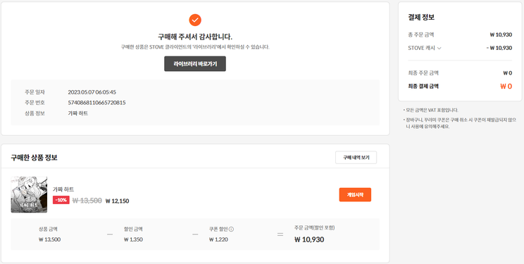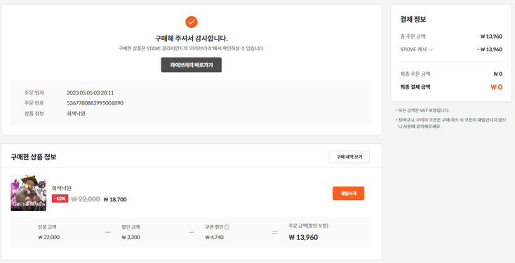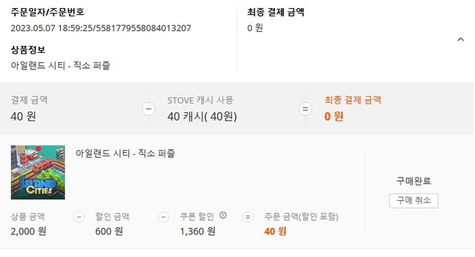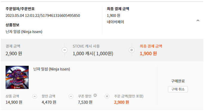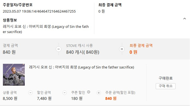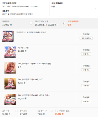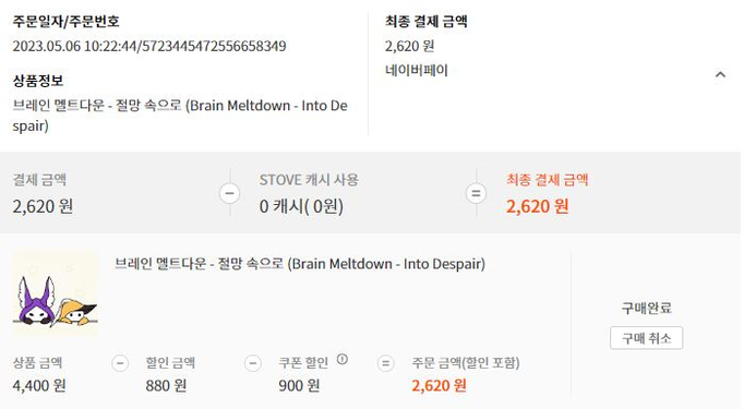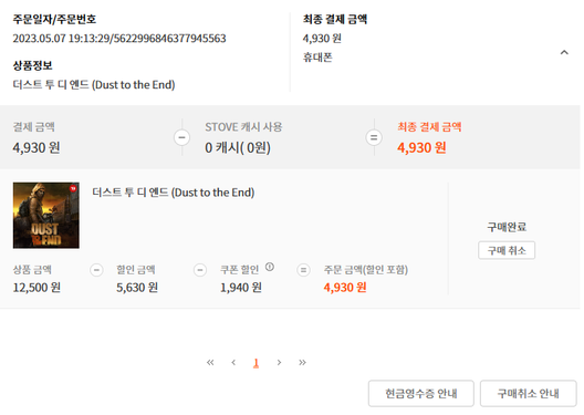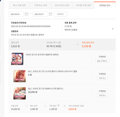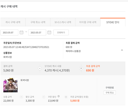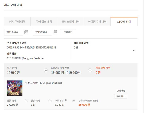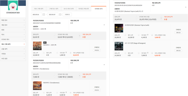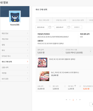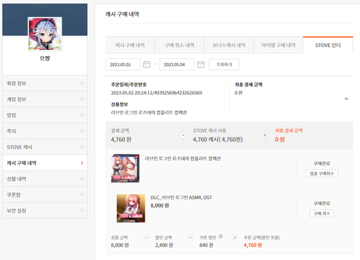§'내정보 > 캐시 구매 내역 > STOVE 인디' 에서 구매 내역 캡쳐