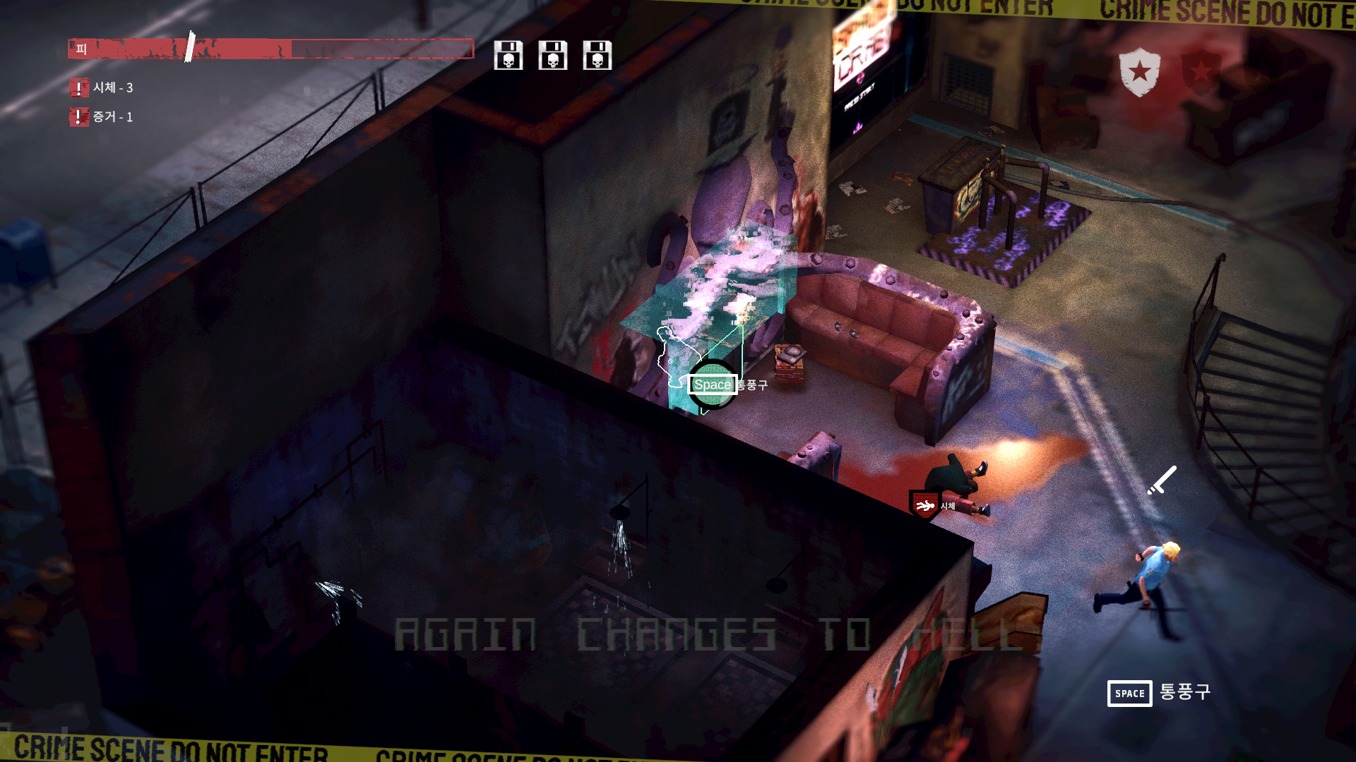 청소가 끝나려면 세가지 조건을 모두 충족해야 합니다. 피를 일정 수준 이하까지 줄일 것. 시체를 전부 치웠을 것. 증거물들을 모두 주웠을 것. 이 모든걸 최대한 들키지 않으면서 진행해야 하죠. 들키지 않기 위해 맵에 있는 여러 상호작용들을 사용하여 경찰들을 유인하거나, 특정 장소에 숨어 경찰들이 가기를 기다릴 때는 정말 '잠입'을 하고 있다는 느낌이 들게 해줍니다.