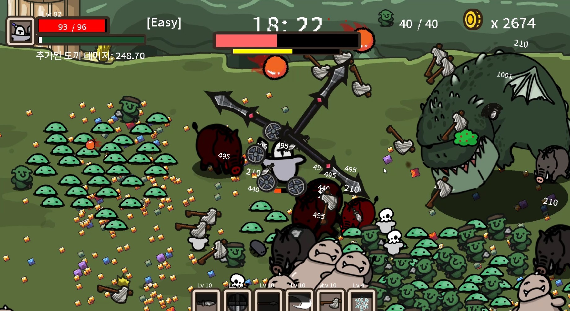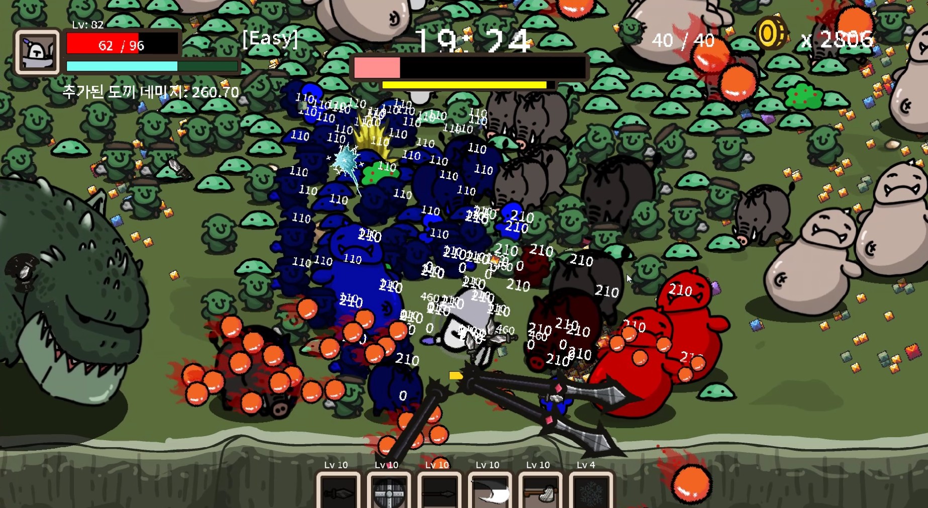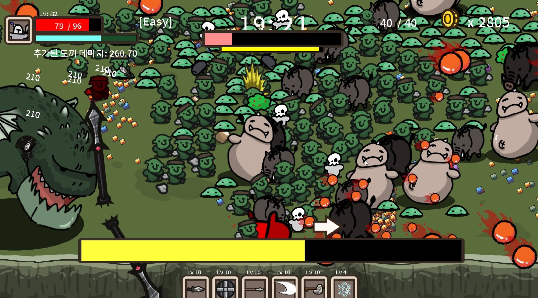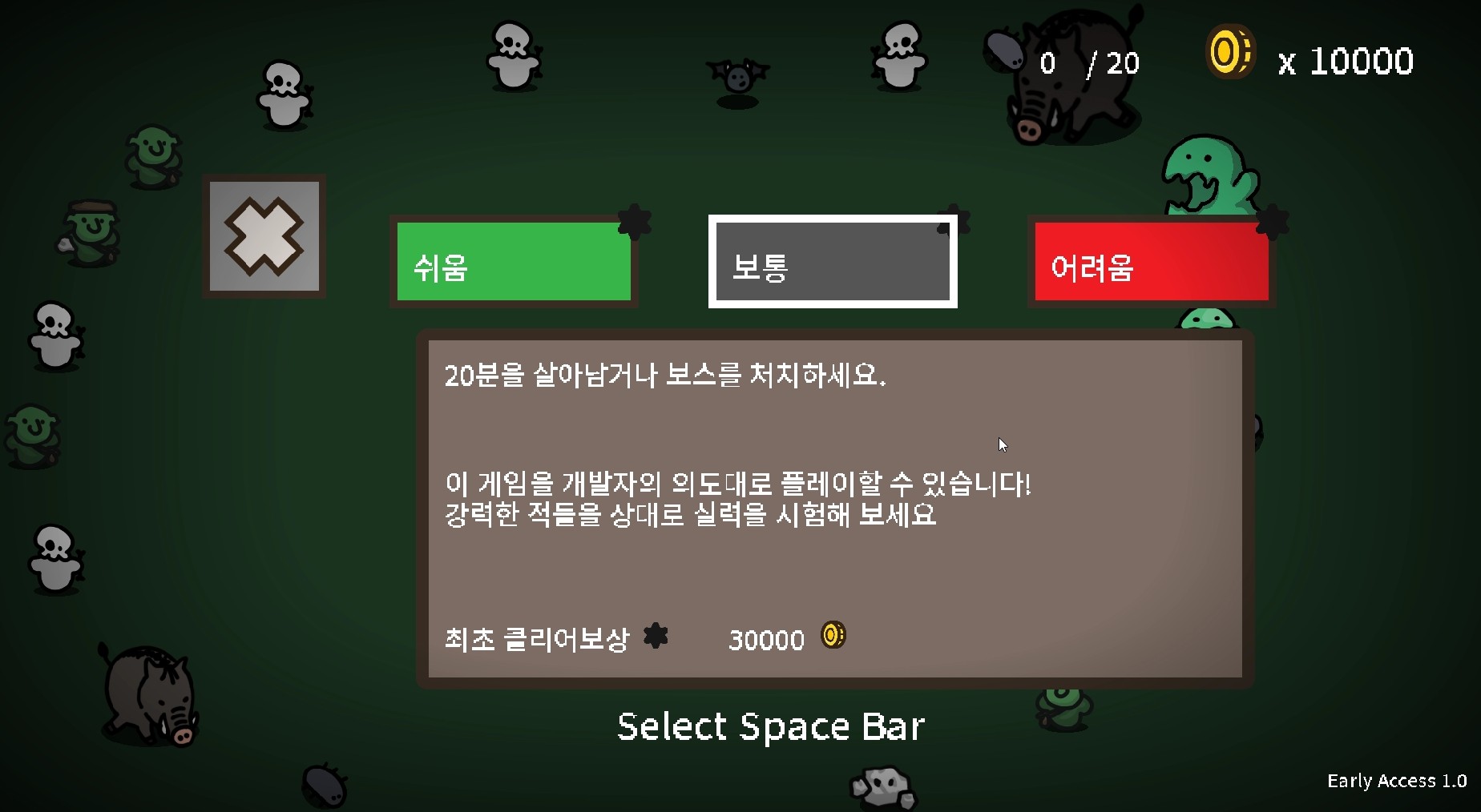 일단 뱀서라이크가 익숙하지 않은 분들도 쉽게 즐길 수 있도록 쉬움 난이도를 제공, 이후 실력이 쌓이는 느낌이 들면 그 때부터 보통과 어려움을 선택하고 즐기는 게 가능해요