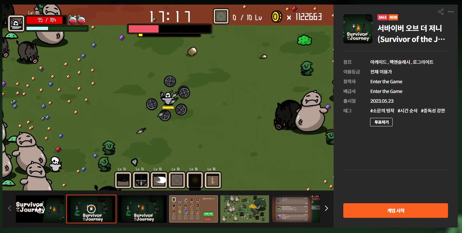 슬레이 더 스파이어가 많은 사랑을 받은 뒤 슬더슬류 로그라이트 게임들이 쏟아졌던 것처럼 뱀파이어 서바이버즈가 불러온 새로운 바람에 탑승한 게임들을 쉽게 찾아볼 수 있어요. 지금은 약간 시들해진 느낌이지만 여전히 높은 중독성을 가지고 있어 많은 분들이 뱀서라이크 장르의 게임들을 즐기고 있고 오늘 소개해드릴 게임은 바로 그 중 하나에 속하는 게임입니다
