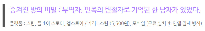 '숨겨진 방의 비밀 : 부역자'는 꽤 입소문을 탄 국내 인디 게임 중 한 작품이긴 하지만 이 작품도 어느새 출시된 지 4년이 넘어가고 있기에, 이쯤에서 한 번은 더 소개해를 해 드리고 싶은 작품이라, 이번 '발굴 프로젝트'에 포함시키게 되었습니다.