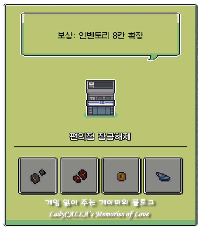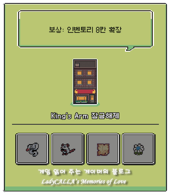 정식 버전에서는 '식당'과 '편의점' 그리고 'King's Arm'을 해금하는 것으로서, 인벤토리를 8칸씩 추가로 더 확장하는 것이 가능해졌습니다.