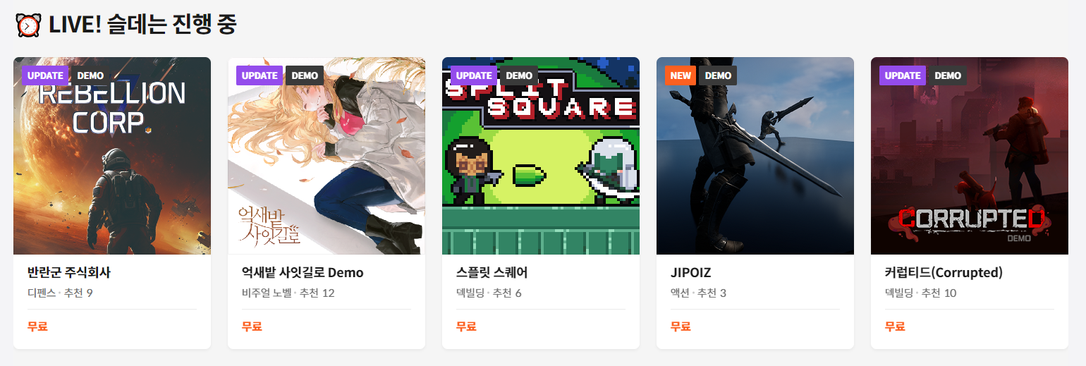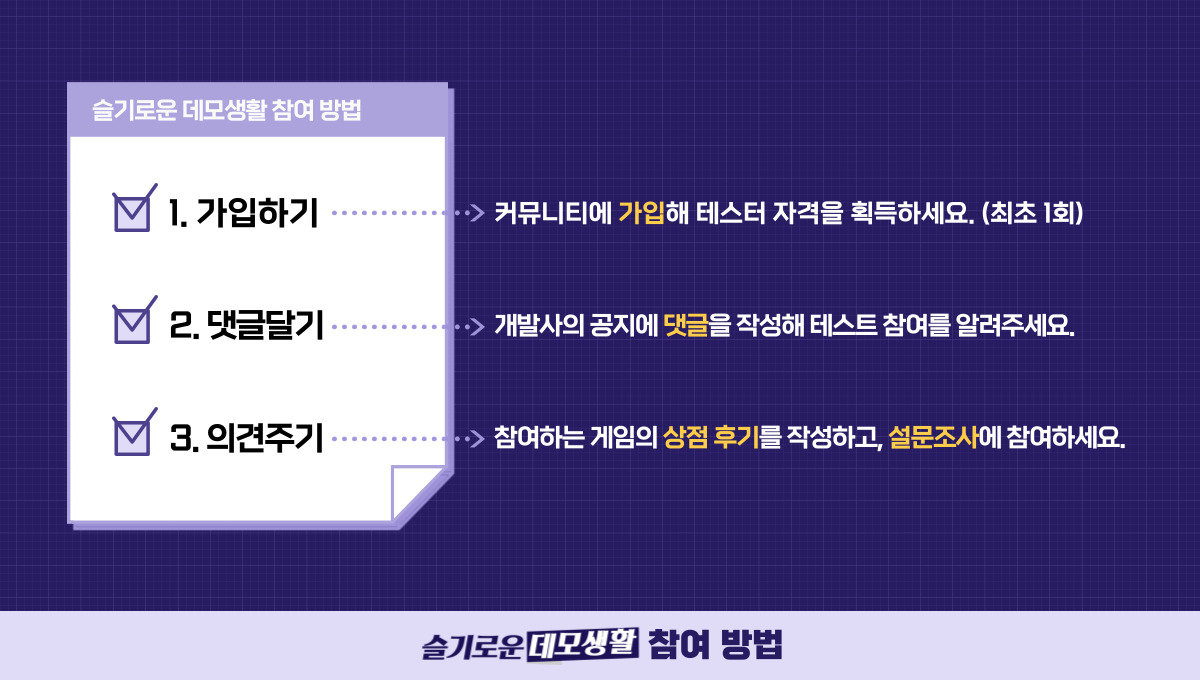 지금! 슬기로운 데모생활 커뮤니티에서는 5개의 게임 테스트가 진행되고 있습니다.