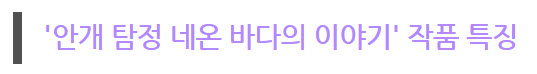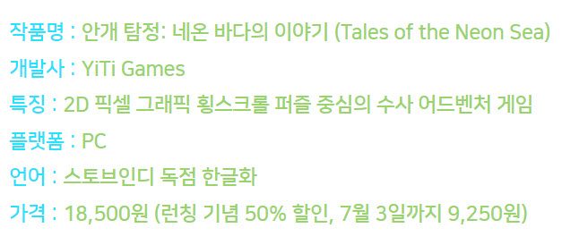 안개 탐정 : 네온 바다의 이야기는 2019년 4월 30일에 출시된 'Tales of the Neon Sea'를 스토브인디에서 독점으로 한글화하여 6월 27일에 출시한 신작 수사 어드벤처 게임이다.