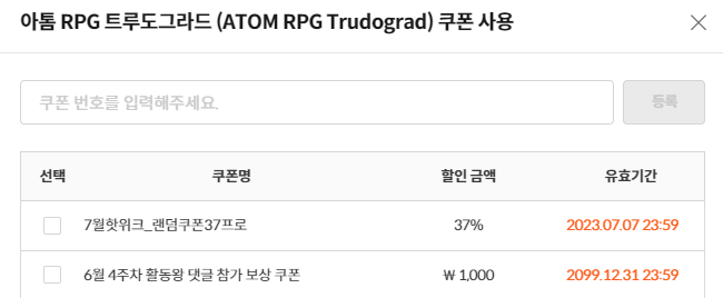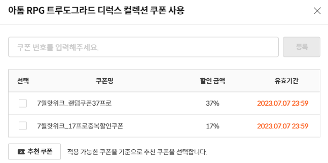 트루도 디럭스의 경우 랜덤 쿠폰(중복불가)나 17%쿠폰(중복가능) 모두 적용가능하지만 출첵이나 커뮤니티 보상쿠폰 등의