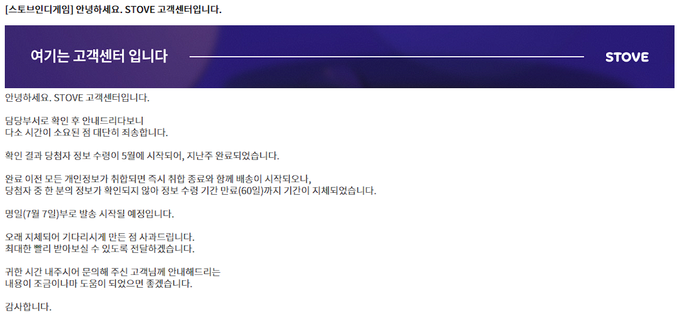 그런데 당첨 사실은 모르다가, 자그마치 5월 말이 다 되어서야, 해당 당첨과 관련해 수령 정보 입력해 달라는 스토브 알림을 보고서야 당첨 사실을 알게 되었네요.