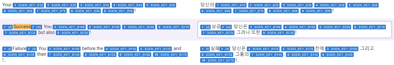 같은 단어뿐만 아니라 문장또한 한번 번역을하면 필요한 곳에 자동으로 조합되어 출력되는 방법이 채택되고 있습니다.