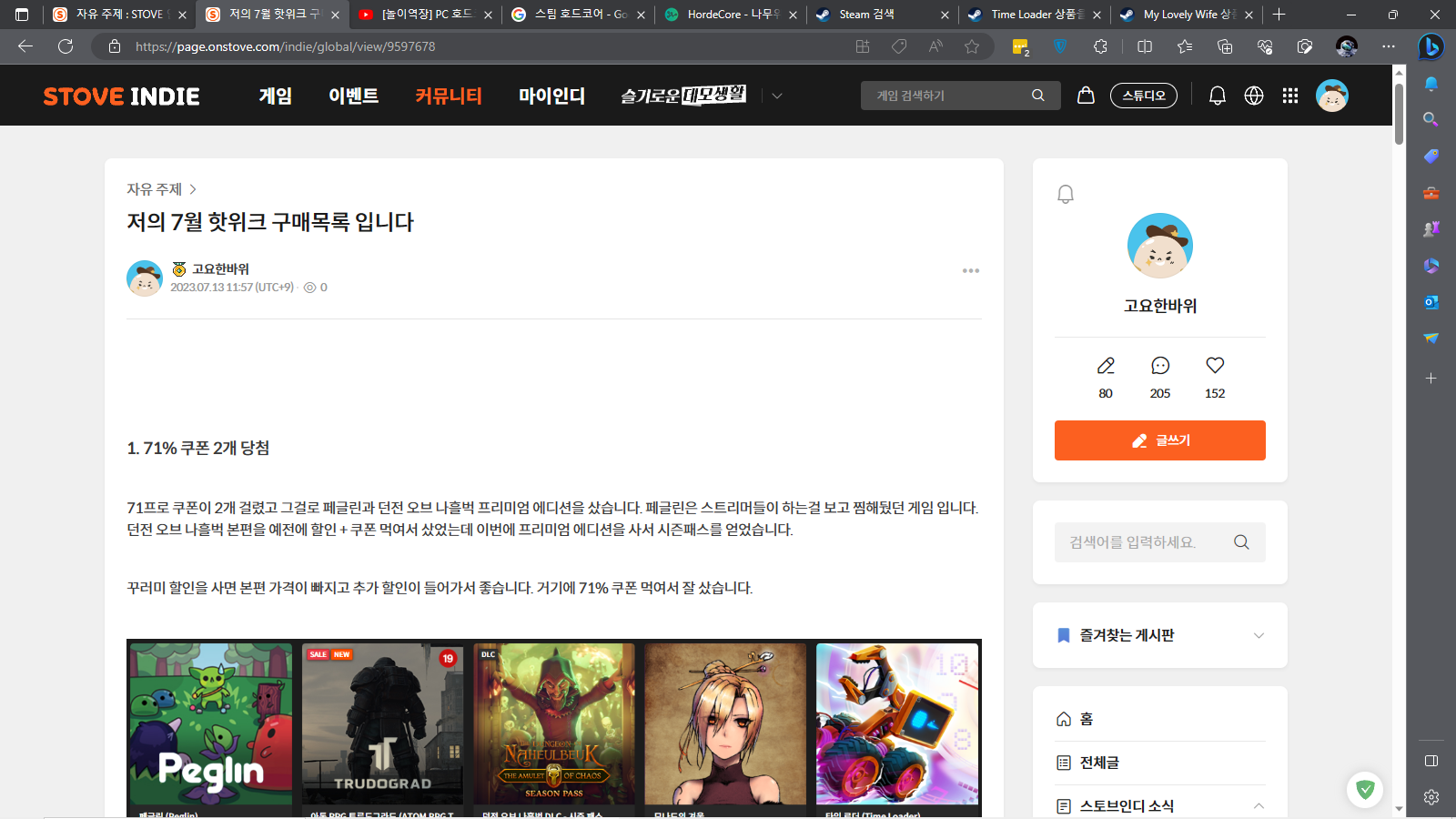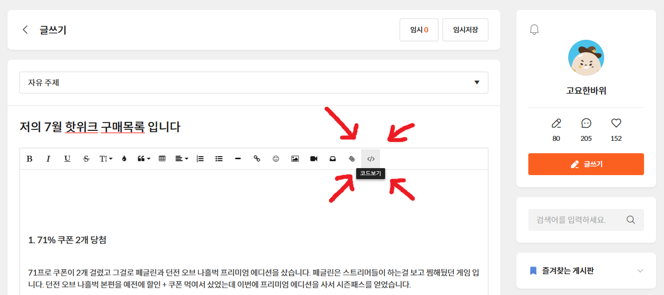 * 런쳐에서 커뮤니티를 눌러 들어오는게 아니라 크롬이나 엣지 등의 브라우저에서 바로 스토브에 로그인한 후 글쓰기 -> 코드보기 -> 코드 붙여넣기~