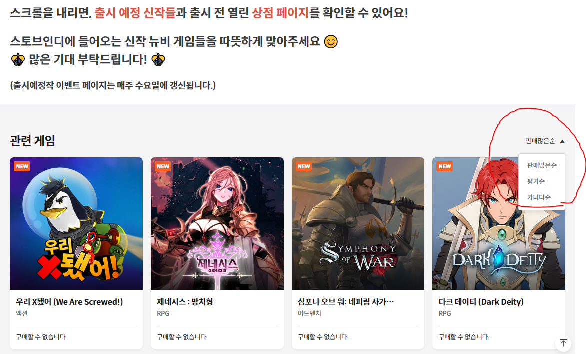 스토브 출시 예정작에 들어가면 정렬 기능이