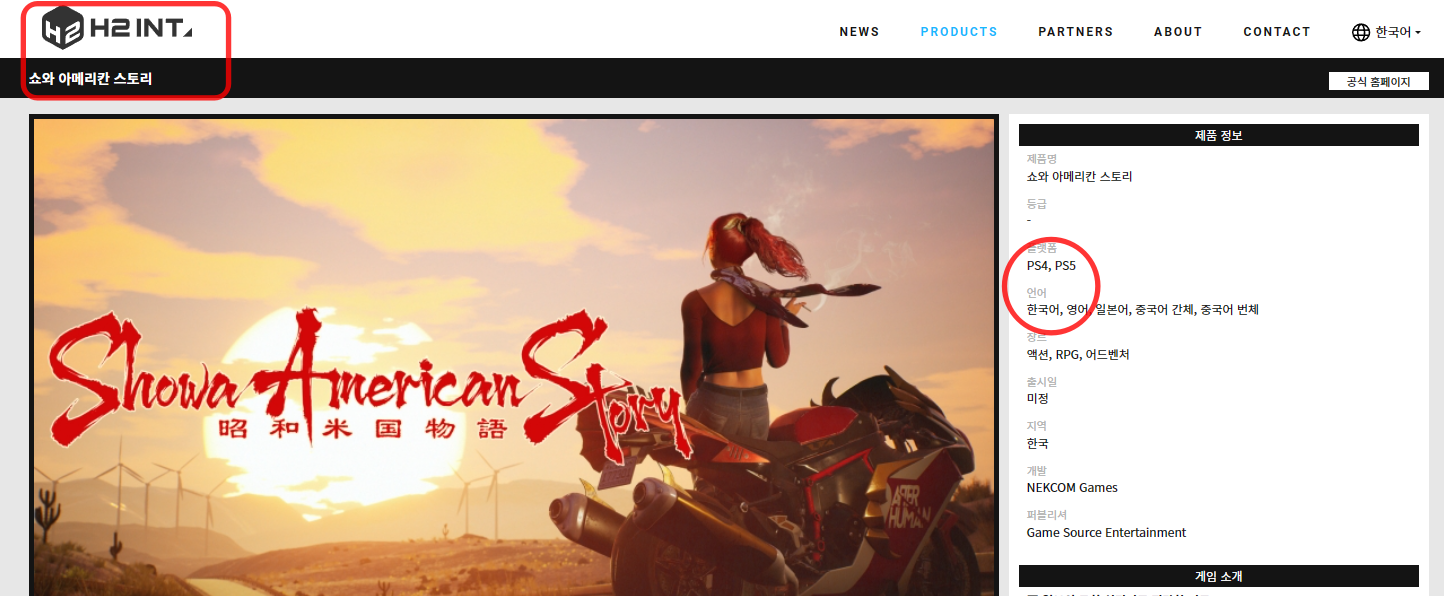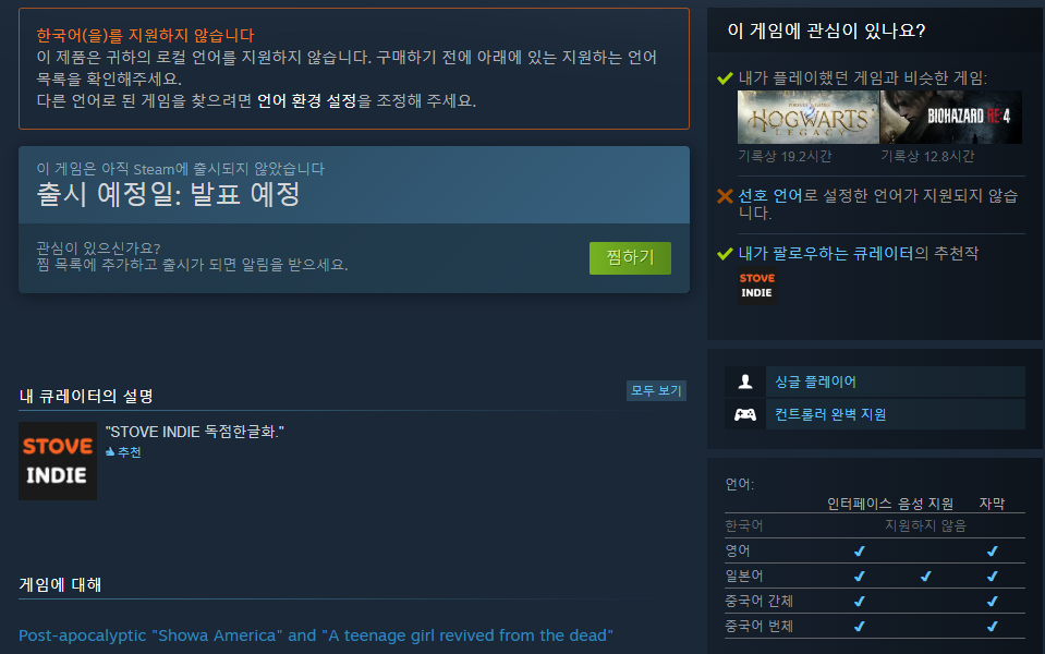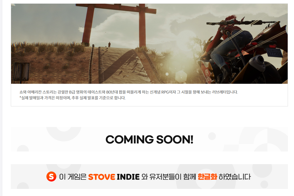 2023년 발매 예정인 쇼와 아메리칸 스토리의 경우 PS4, PS5, 스토브에서 한국어를 지원합니다.