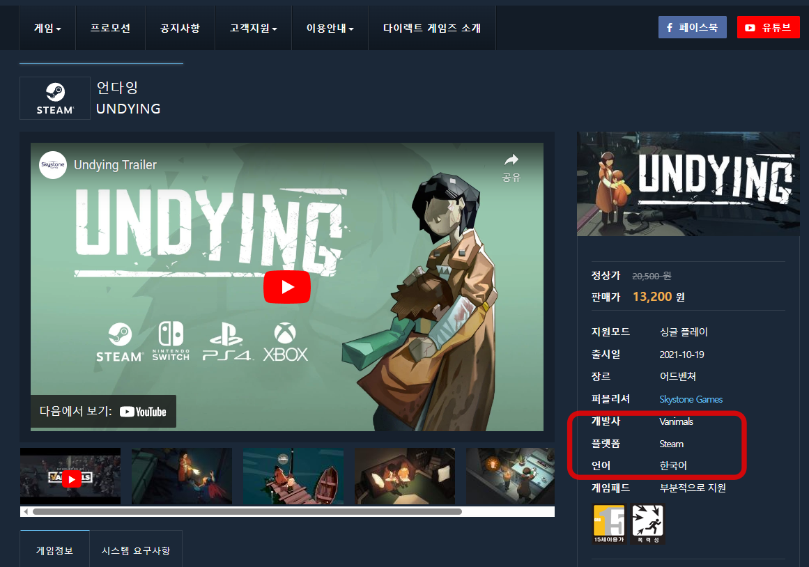 보면 H2에서 판매중인 다이렉트 게임즈에서 스팀 키를 팔고 있는데 여기 보면 스팀판이 한국어 지원한다고 되어 있습니다. H2가 언다잉 회사와 따로 현지 화 관련 계약을 했다고 추측하는 이유입니다.