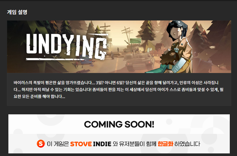 언다잉은 스토브 한글화로 발매할 예정인데 이게 H2에서 서비스하는 다이렉트 게임즈에서 도 한국어가 지원되고 있더군요