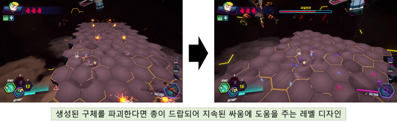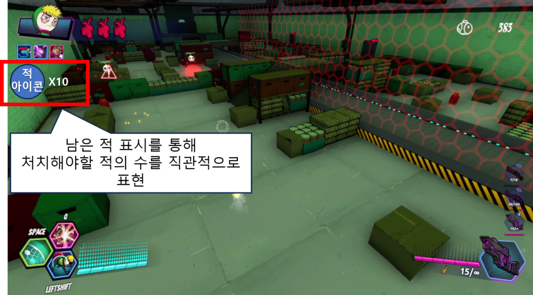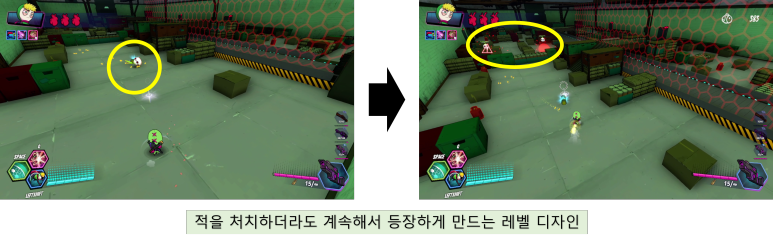 이를 직관적으로 표시하여 처치해야하는 적의 개수를 알려준다면 추가적으로 생성하는 레벨디자인의 의도를 잘 알 수 있을 것 같습니다.