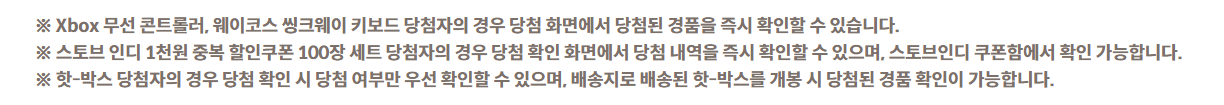 엑박 패드, 키보드의 경우 당첨화면에서 즉시 확인가능하고 스토브 인디 천원X100장도 당첨즉시 확인 가능하니