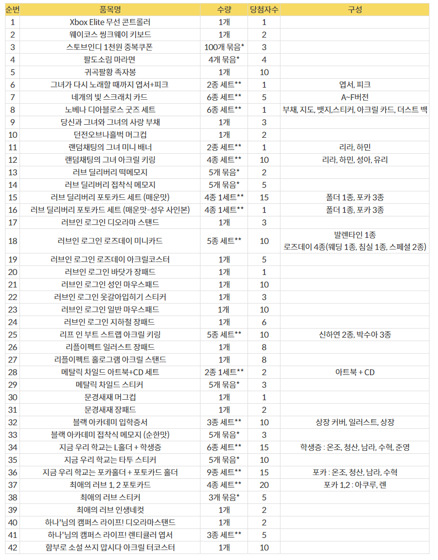 갠적으론 스티커 같은 굿즈보단 패드류나 머그컵 같은 실용적이고 실제 사용가능한걸 선호하지만 상품 갯수로 봐서는 포토카드나 스티커류가 걸릴 확률이 높긴할듯;;ㄷㄷ