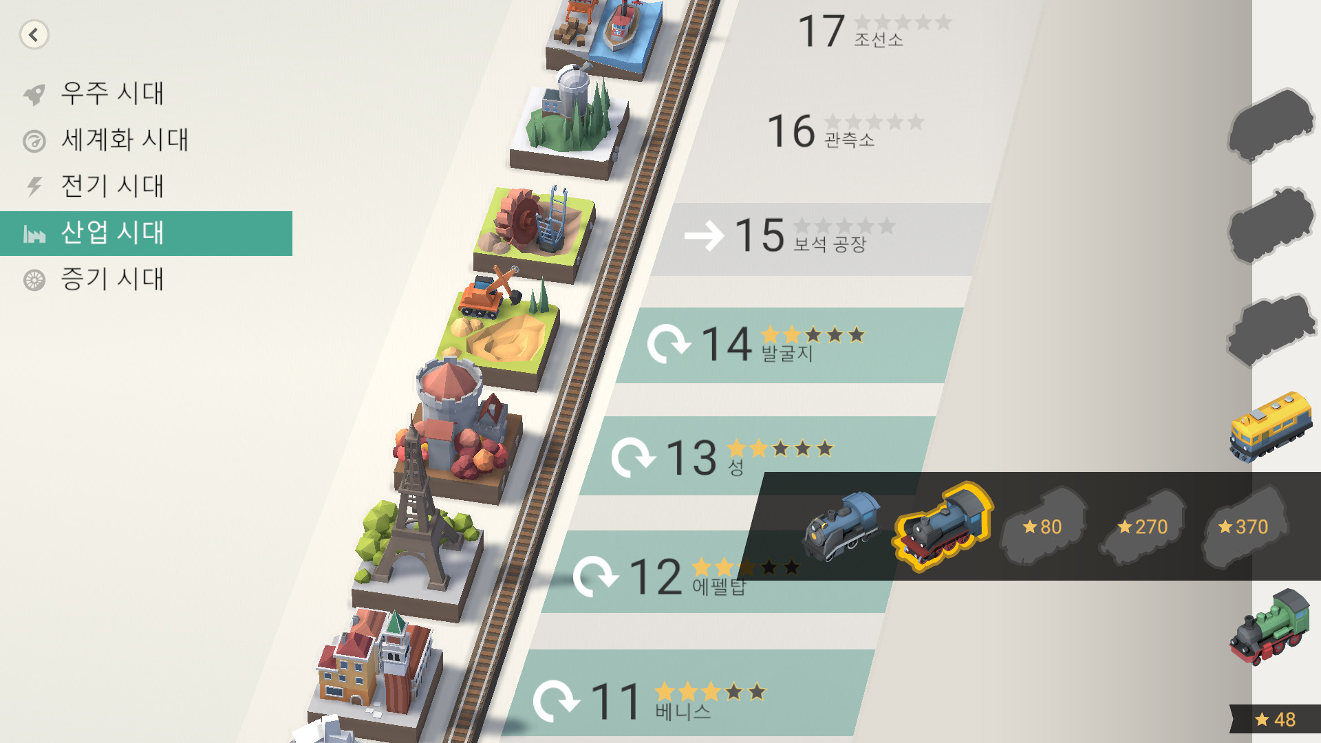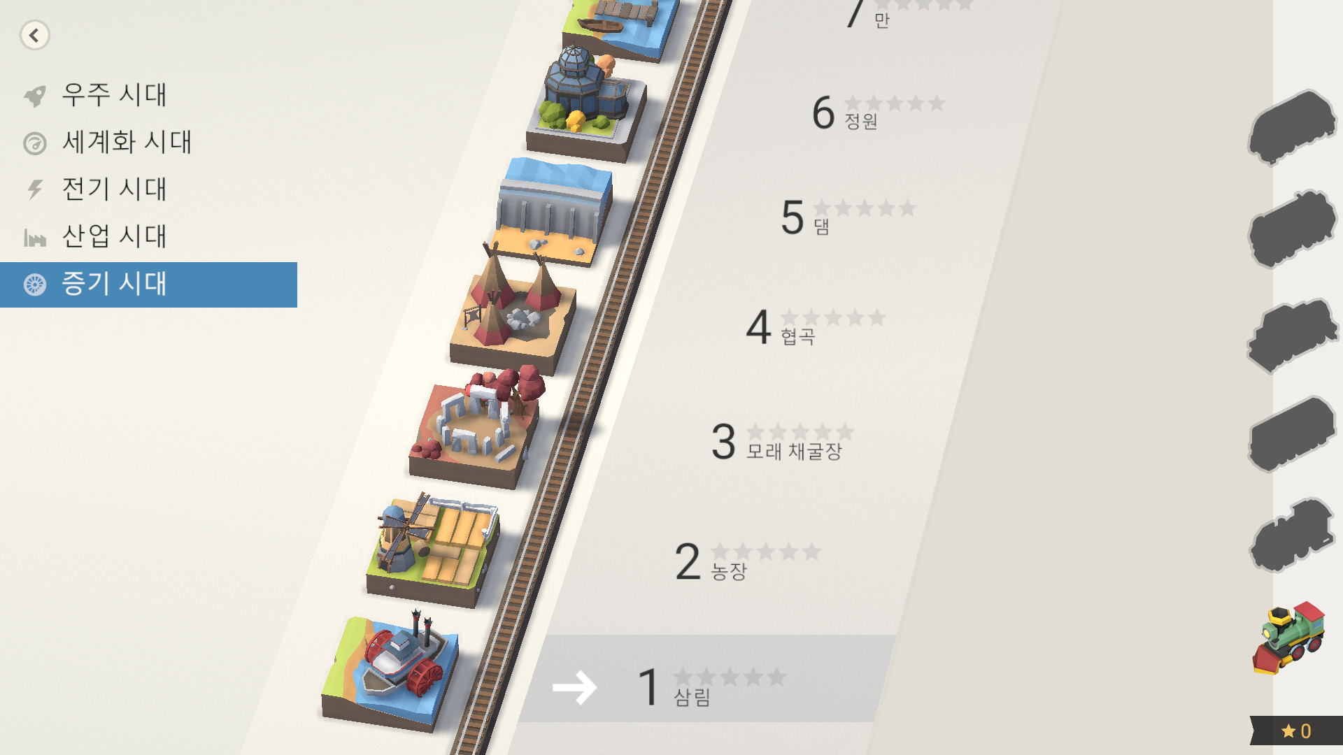 아마도 별 5개를 다 모은 경우 랭킹이 기록되고 이 기록을 서버에 올려서 다른 유저와 경쟁 할수 있다보니 기차 종류만 열리는 것으로 잡은듯 한데, 기차 종류도 차별화 되는 다양한 모습이 있었으면 어땠을까 합니다.