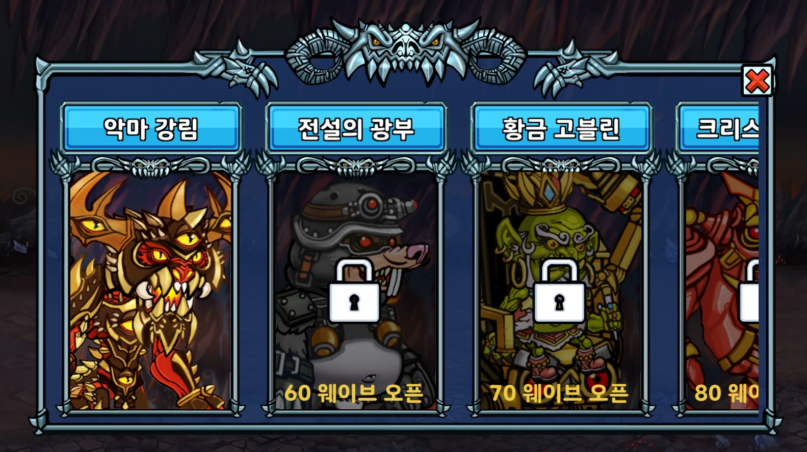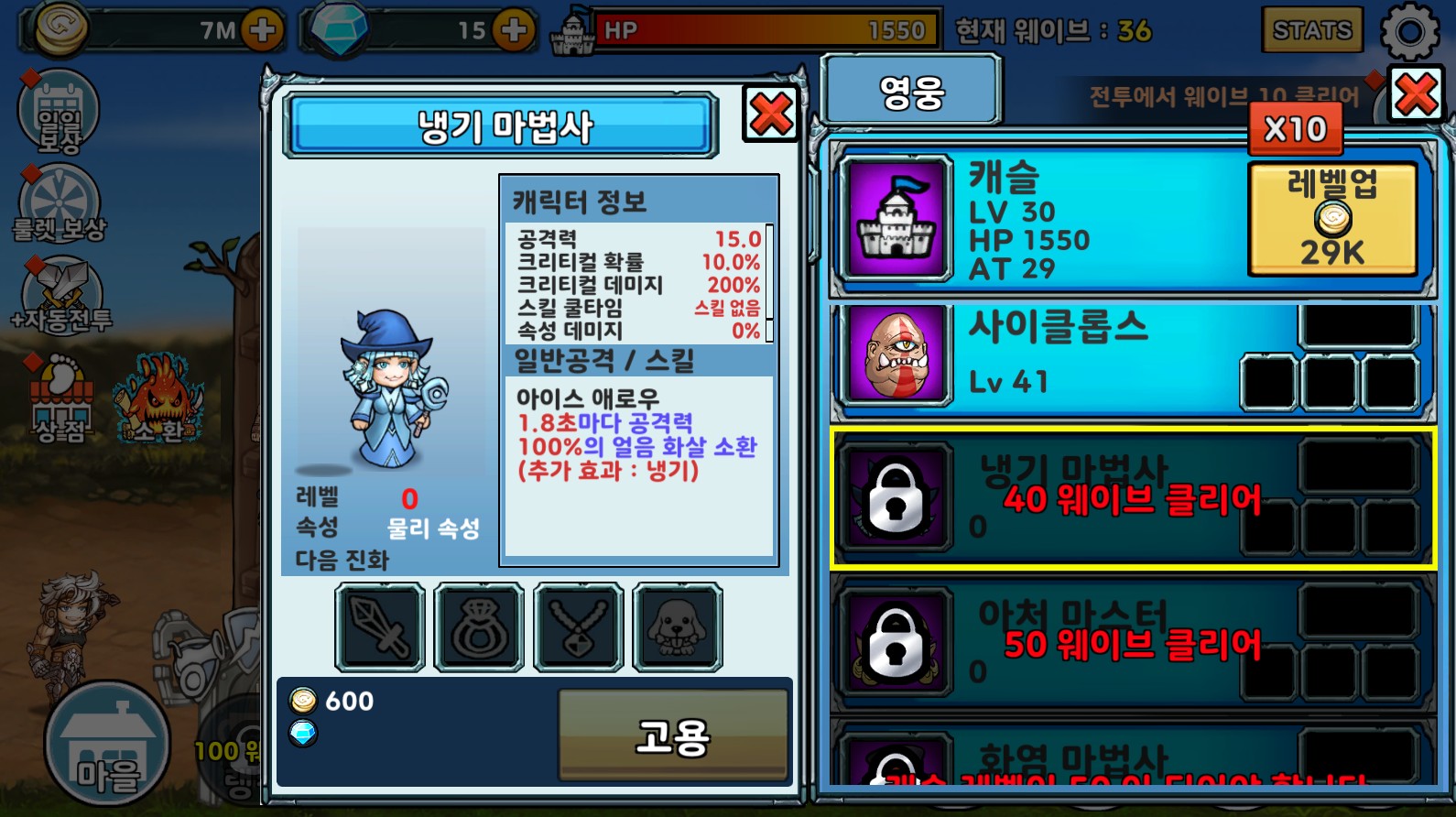 웨이브가 진행됨에 따라 당연히 더욱 강력한 적들이 등장하게 되고 그런 적들을 상대하기 위한 방법으로 타워 히어로 타워 디펜스는 영웅들을 해금, 성장시키는 담백한 방식을 사용하고 있어요. 플레이어 영웅부터 시작해 캐슬의 레벨을 올리고 일정 웨이브를 돌파하면 다양한 영웅들을 해금할 수 있습니다