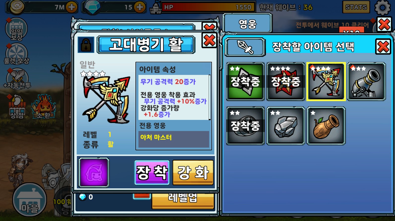 이외에도 각 장비마다 어울리는 영웅이 존재, 강화를 통해 무기의 위력을 성장시켜나갈 수 있어 이 방법으로도 더 많은 웨이브까지 전진해나갈 수 있어요