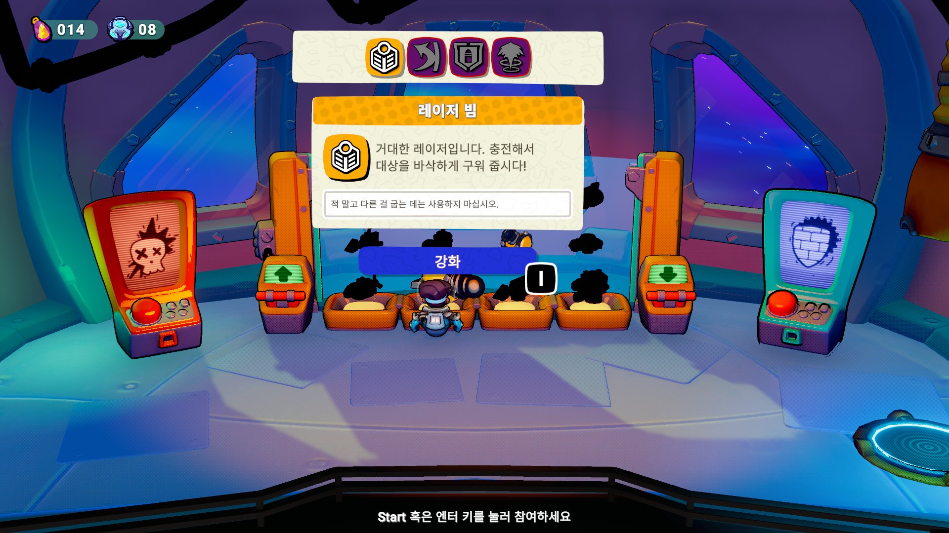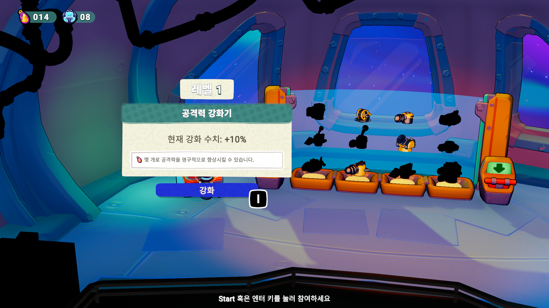 공격력 강화는 전체적인 데미지 향상, 무기는 무기의 특성 추가 + 스테이지 시작할 때 획득, 선체 강화는 방어력 증가 입니다.
