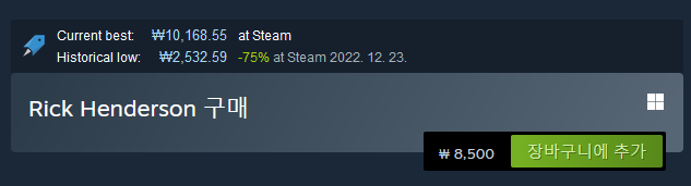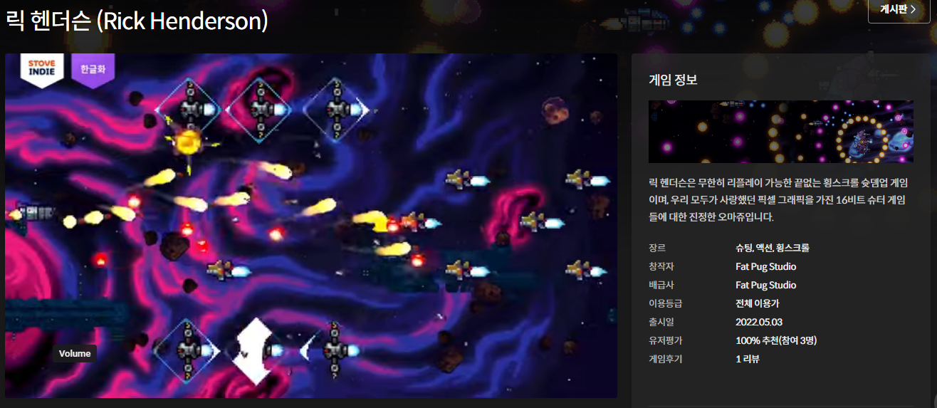 사실 릭 핸더슨은 정가 8500원짜리 게임 입니다. 스팀 평가도 긍정적으로 좋은데 아무래도 탄막 슈팅 게임이 유행이 지나기도 했고 홍보도 부족하고 해서 평가 수가 아직 모자랍니다. 번들 같은데 좀 나오면 평가가 늘어날 것 같기는 한데... 최저가로 쳐도 75%가 최대 입니다. 스토브판이 말도 안되게 싼 거죠. 찜해두셔요.