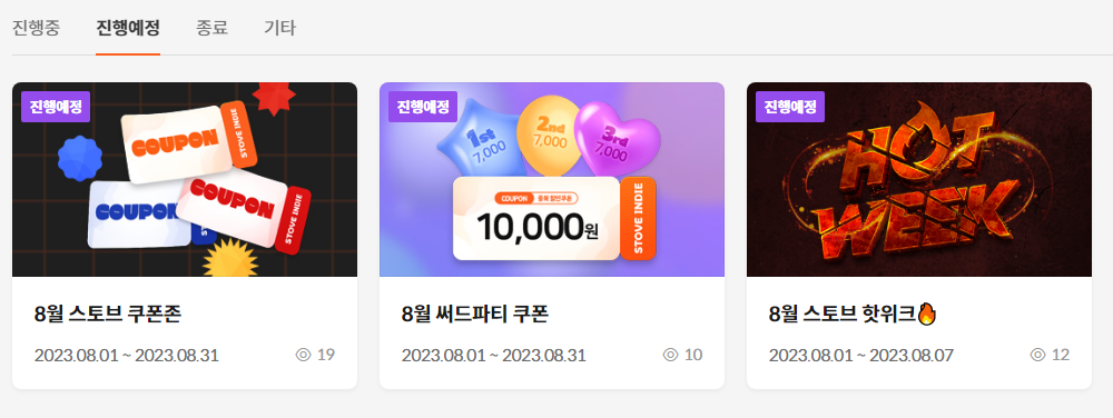 화면 상단 메뉴 이벤트 -> 진행예정에 들어가시면 확인하실 수 있습니다. 혹은 위의 링크를 눌러주세요.