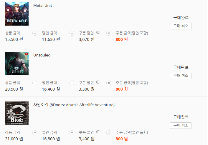 언솔루티드는 난이도가 좀 있다고 들어서 언뜻 구매를 못했는데 좋은 덕분에 한번 사서 도전해보게 되었습니다. 메탈 유닛과 사망여각 모두 이 가격이면 취향 떠나 찍먹해볼만한 작품이라고 생각합니다. 동전 딜 수량이 늘어나고 게임 가짓수도 확 늘어나 메인 이벤트가 된 느낌이네요. 덕분에 망설임 없이 다 샀습니다. 너무 좋습니다. ^ ^
