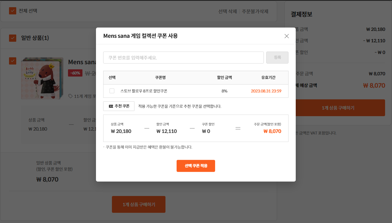 한줄요약. 가격 있는 중복 쿠폰들은 컬랙션 게임 구매시 사용불가 라는게 너무 아쉽습니다