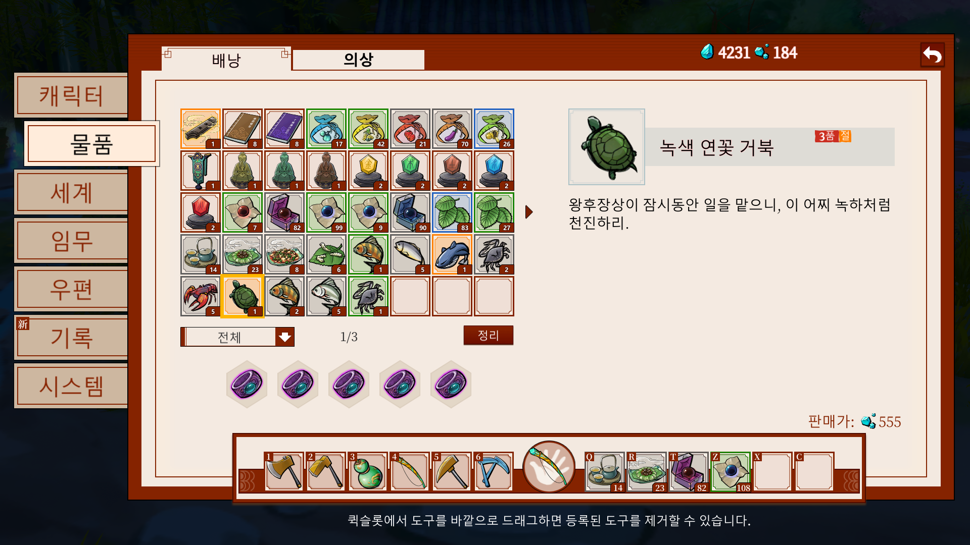 개인적으로는 벽사염유가 제일 어려웠고, 흑수금붕어는 스토리 진행하다 보면 진원주가 하나 보내줘서 추가로 하나 잡았습니다.
