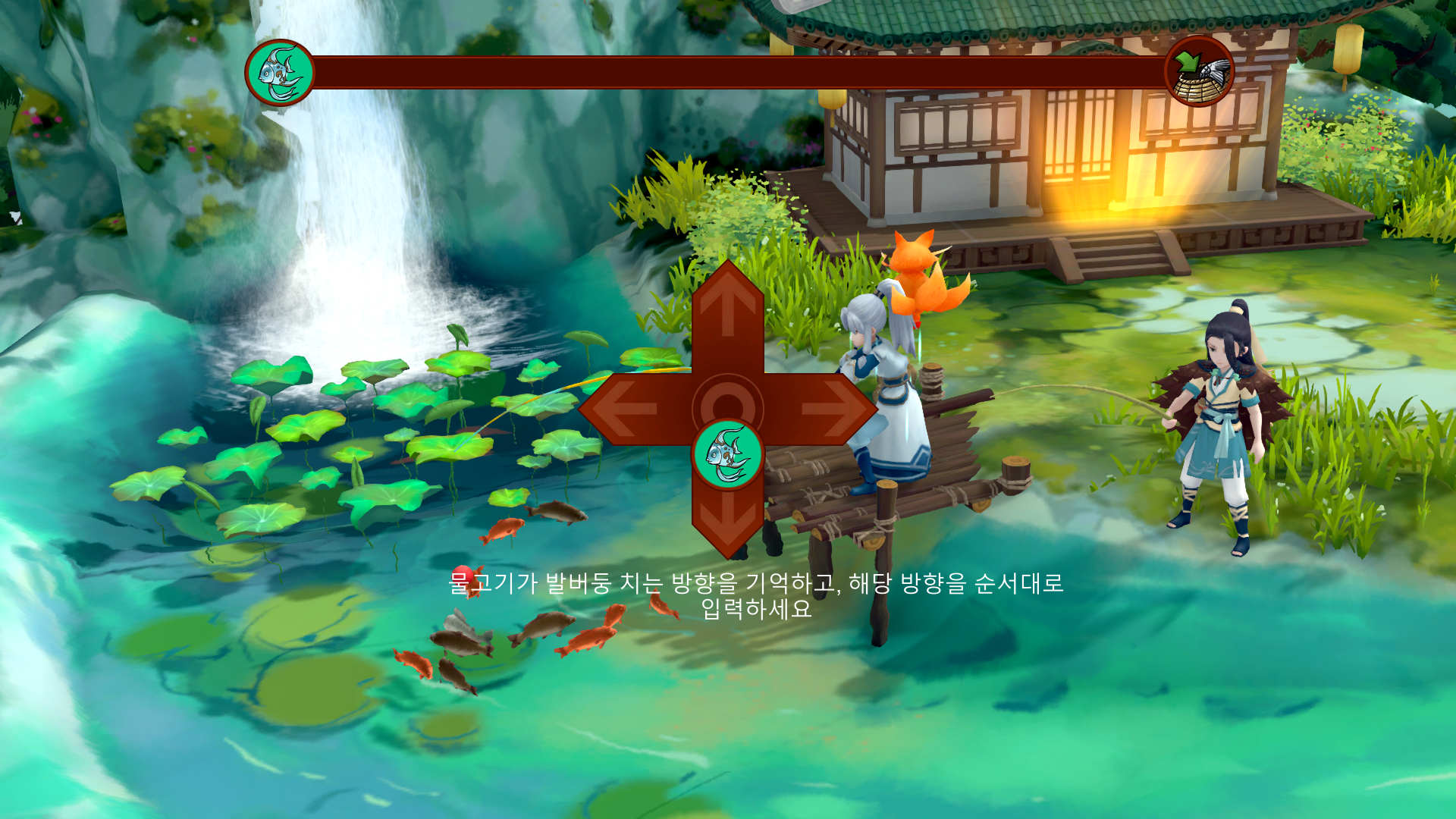 물고기가 상하좌우로 3~7번 움직이고, 그걸 잘 기억했다가 따라하는 걸 3~5번 반복하면 됩니다. 물론 한 번이라도 틀리면 나가리.
