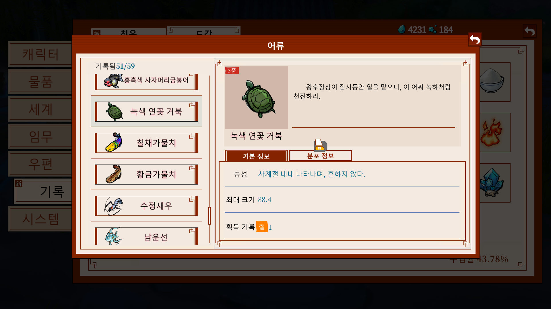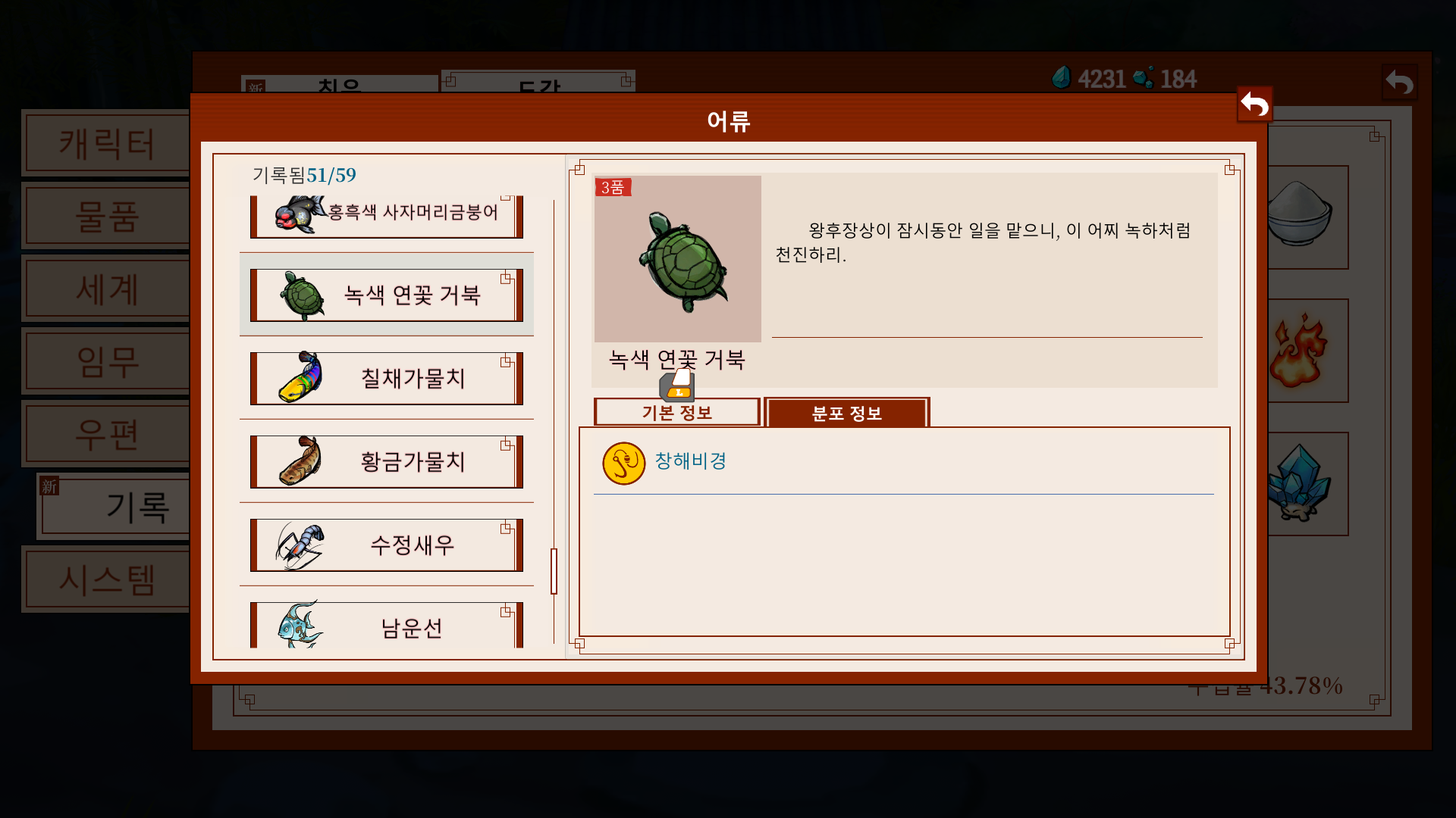 어디서, 어느 계절에, 어느 시간대에 나오는지... 그래도, 다행히 전설의 물고기 노가다를 하는 와중 우연찮게 발견했습니다. 뜬금없이 창해비경에서 나올 줄은 정말 몰랐네요.