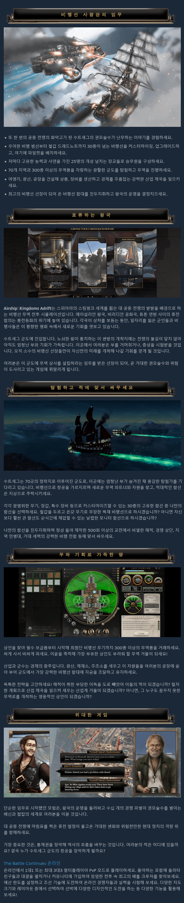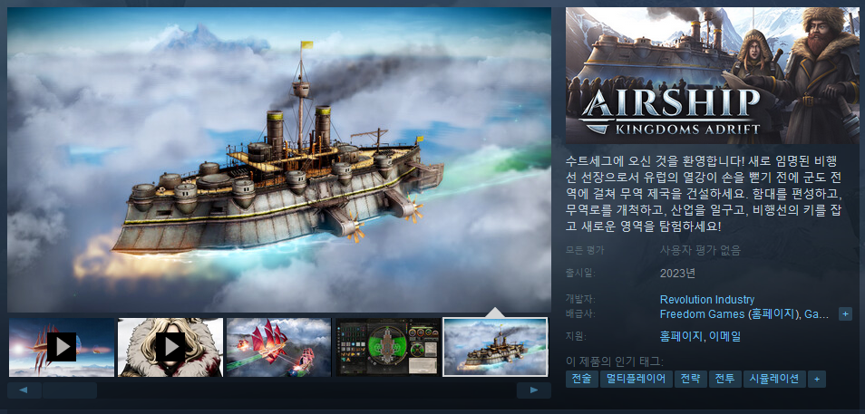 에어본 킹덤의 후속작일까요? 에어쉽 킹덤 어드리프트가 올해에 발매 예정이네요. 그런데 사정은 모르겠지만 개발사가 다르네요? 게임성도 에어본 킹덤과는 좀 다릅니다. 에어본 킹덤이 도시 건설 전략이라면 에어쉽 킹덤은 전투선 업그레이드, 무역, 전략 전투 요소에 초점이 맞춰져 있는 것 같네요. 아래에 3가지 게임에 관련된 정보들 올려볼게요.