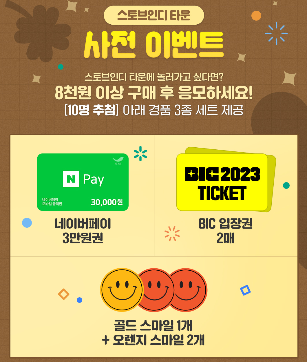 BIC 2023에는 스토브인디 타운이 있습니다. 게임 식으로 설명하면, 스마일을 파밍한 다음 이벤트 상점에서 사용하면 되는데요.