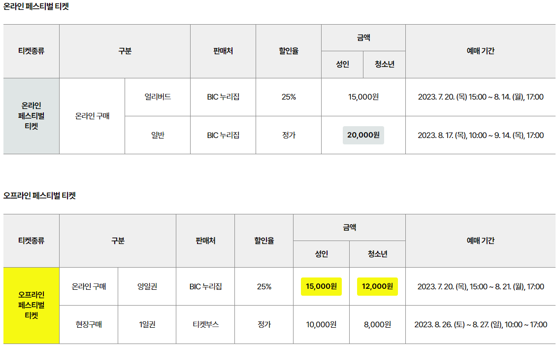 티켓 종류와 가격은 위와 같습니다. 부산에 직접 가기 부담스럽다면 온라인으로 느긋하게 즐겨보셔도 괜찮을 것 같네요.