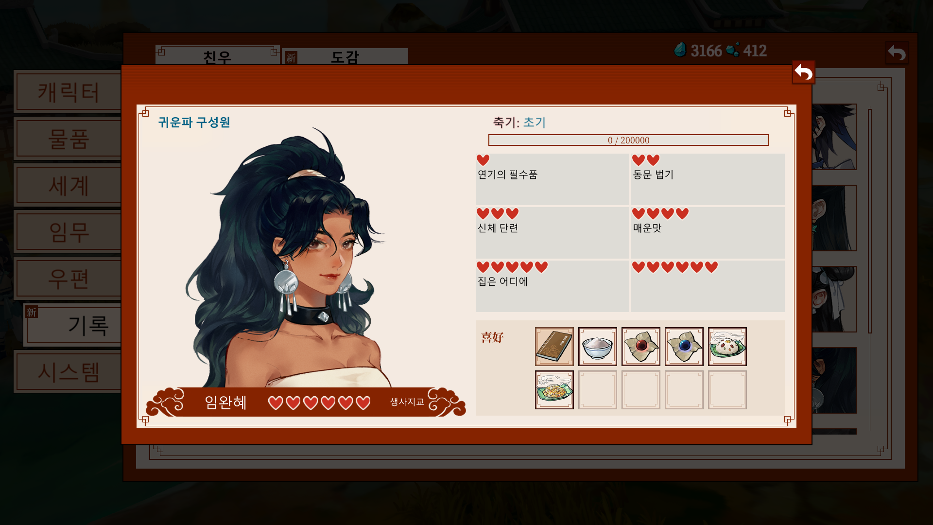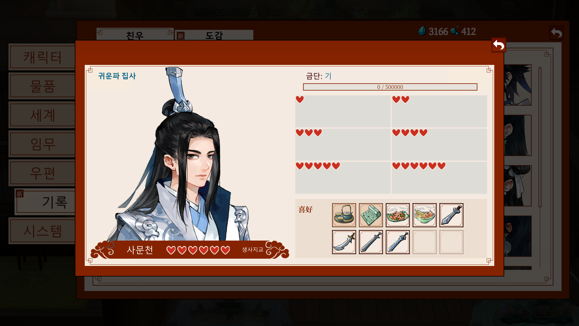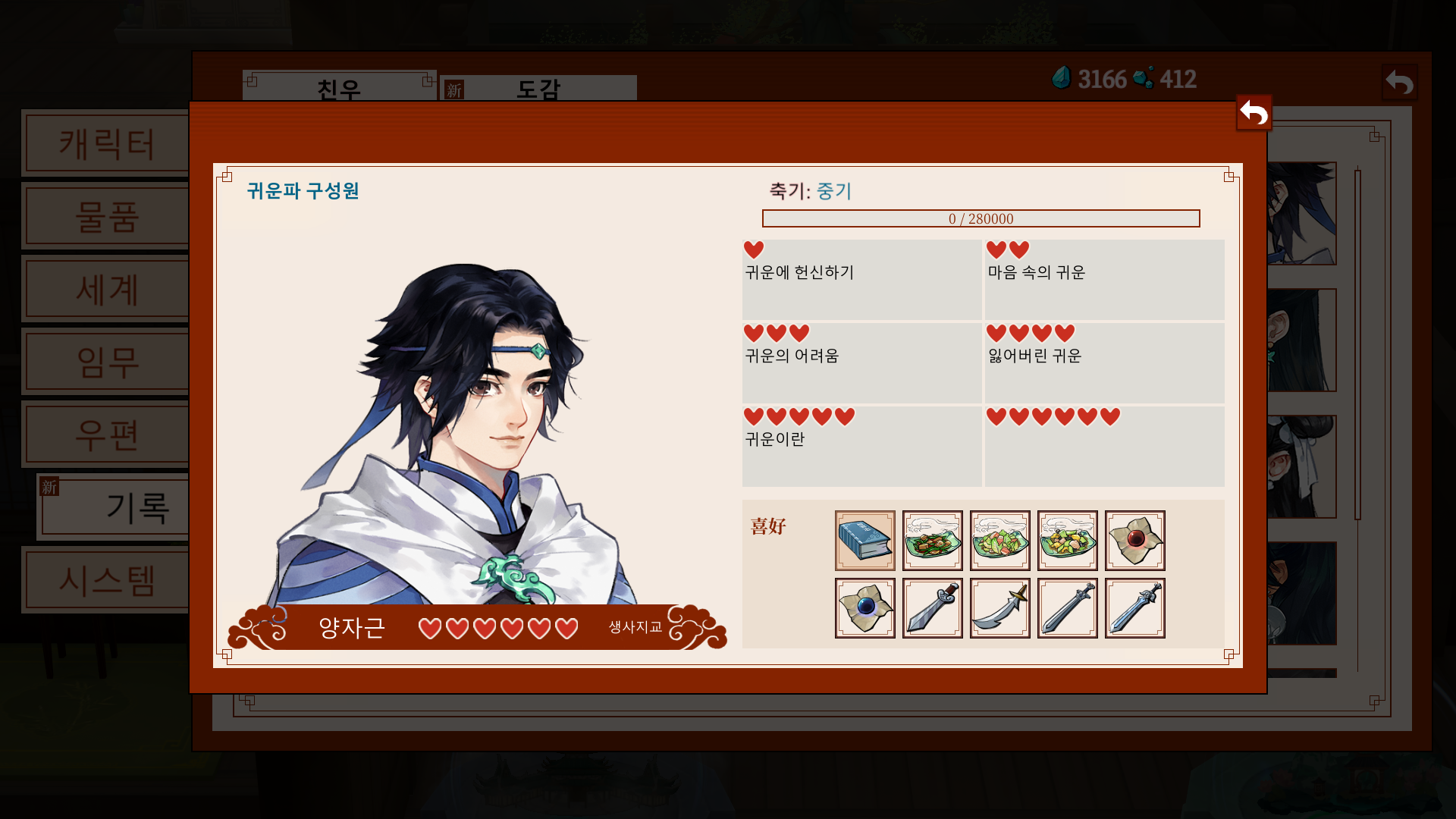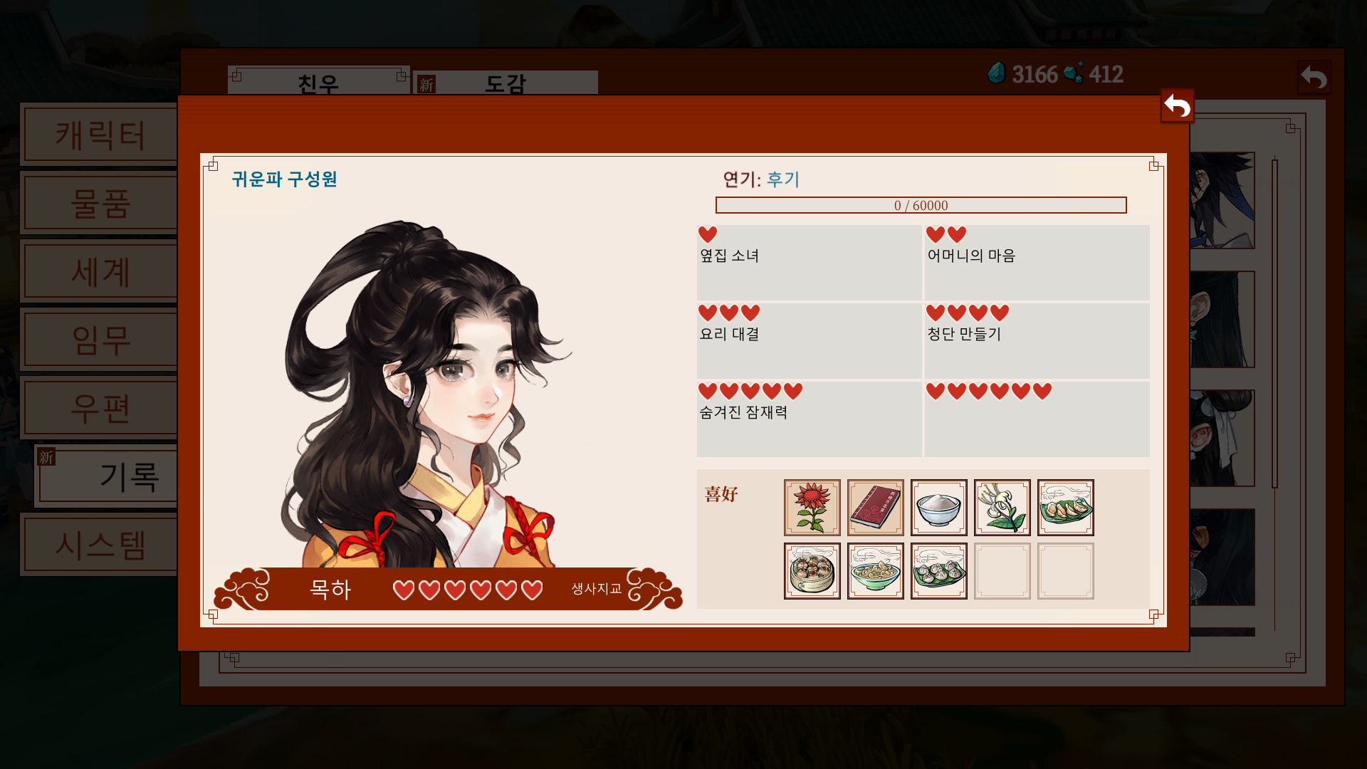 *가이드: 문파 지급품으로 주는 영단을 바탕으로, 비는 날짜에는 요리를 시도해보자.