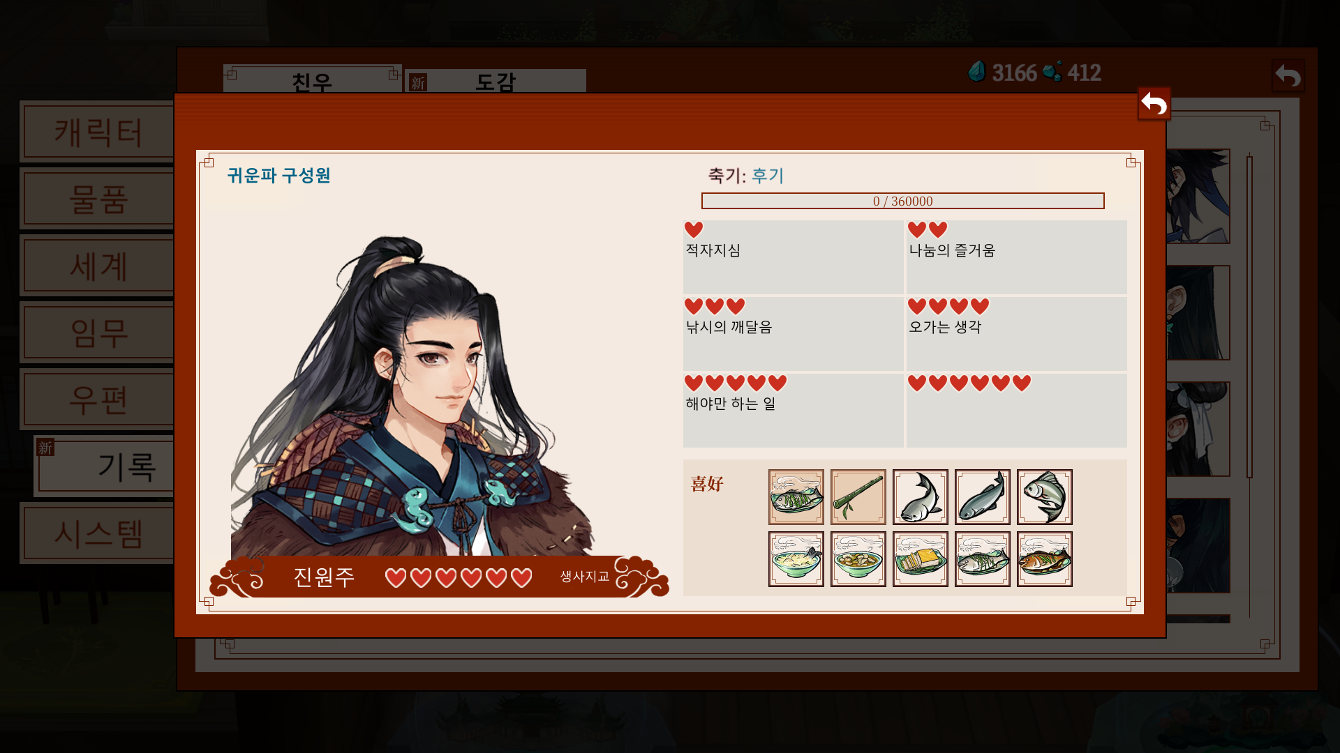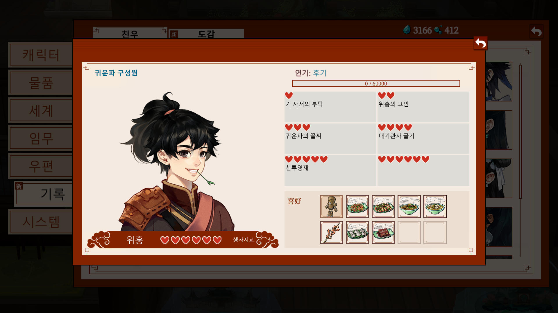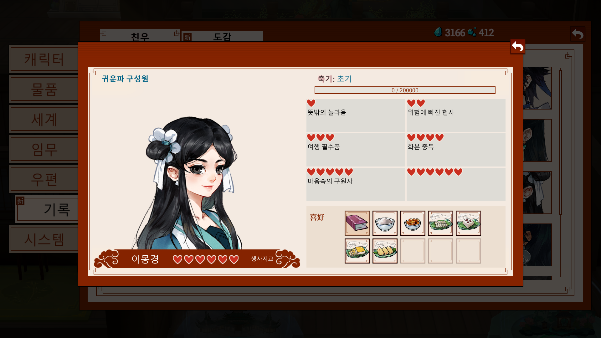 *가이드: 문파 지급품으로 주는 영단을 바탕으로, 비는 날짜에는 요리를 시도해보자.