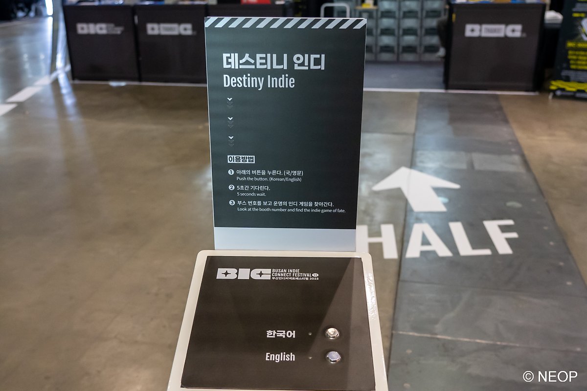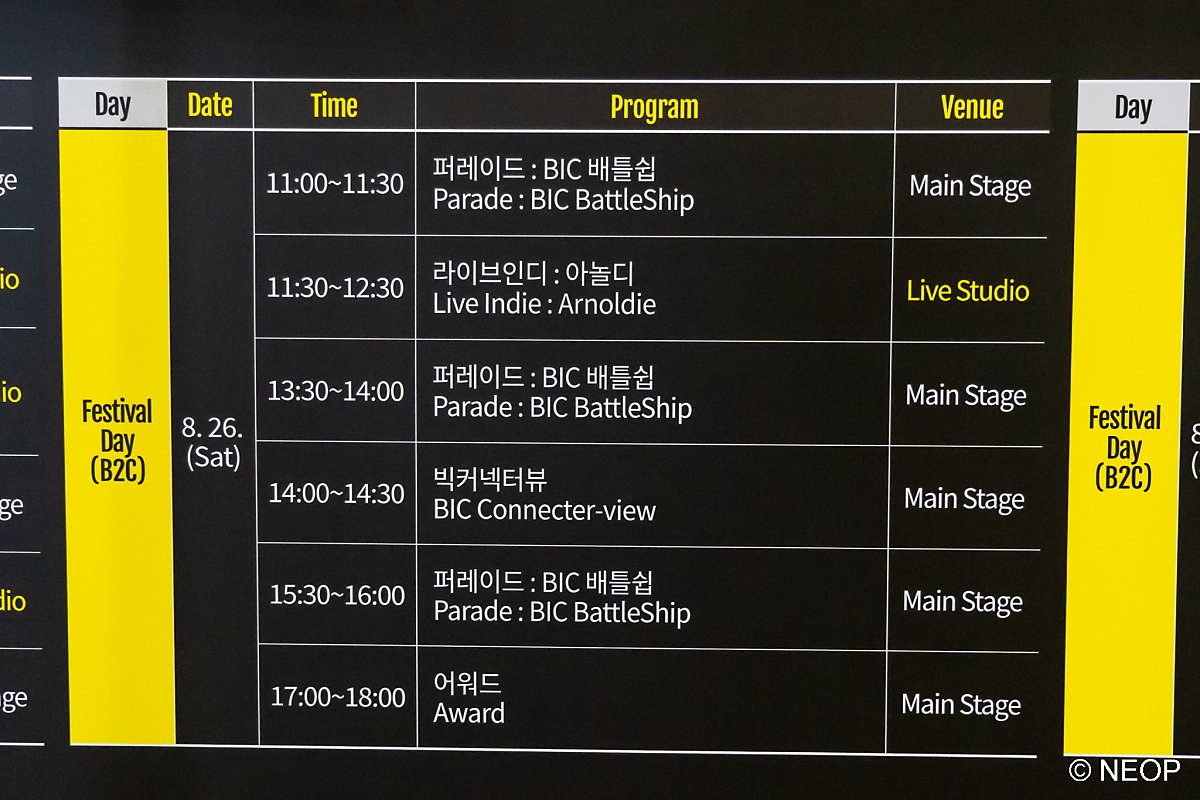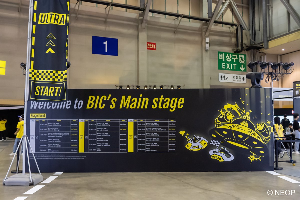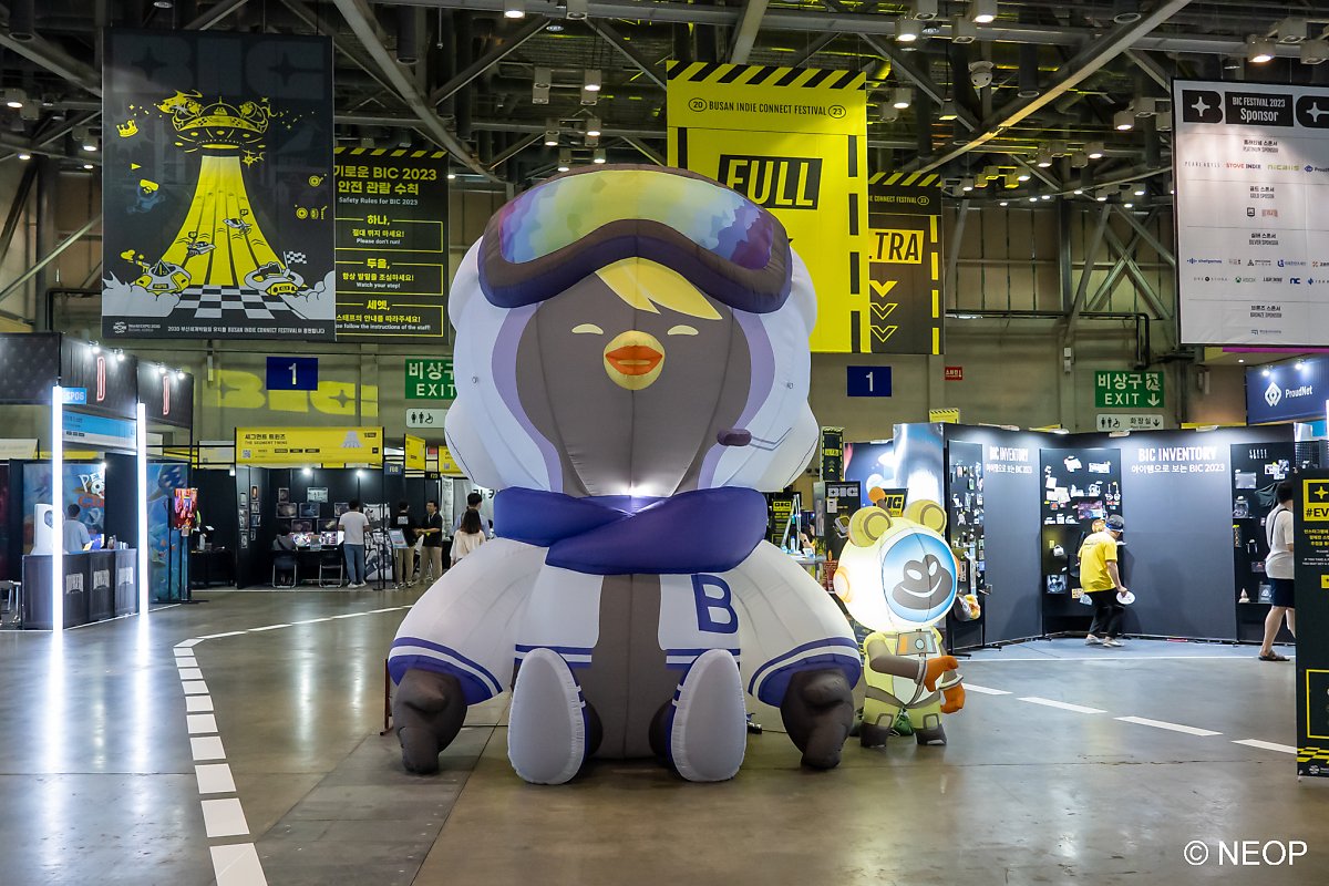행사장으로 들어가면 거대한 BIC 마스코트 캐릭터가 반겨줍니다. 여러 가지 이벤트를 준비해놓았으니 여기저기 놓여 있는 표지판을 꼭 확인하세요. 행사를 다 즐기고 돌아가는 마지막에는 가장 좋았던 게임도 투표하시면 어워드 결과에 반영됩니다.