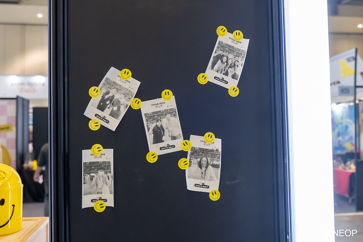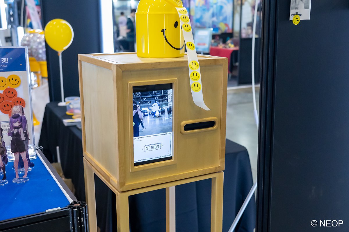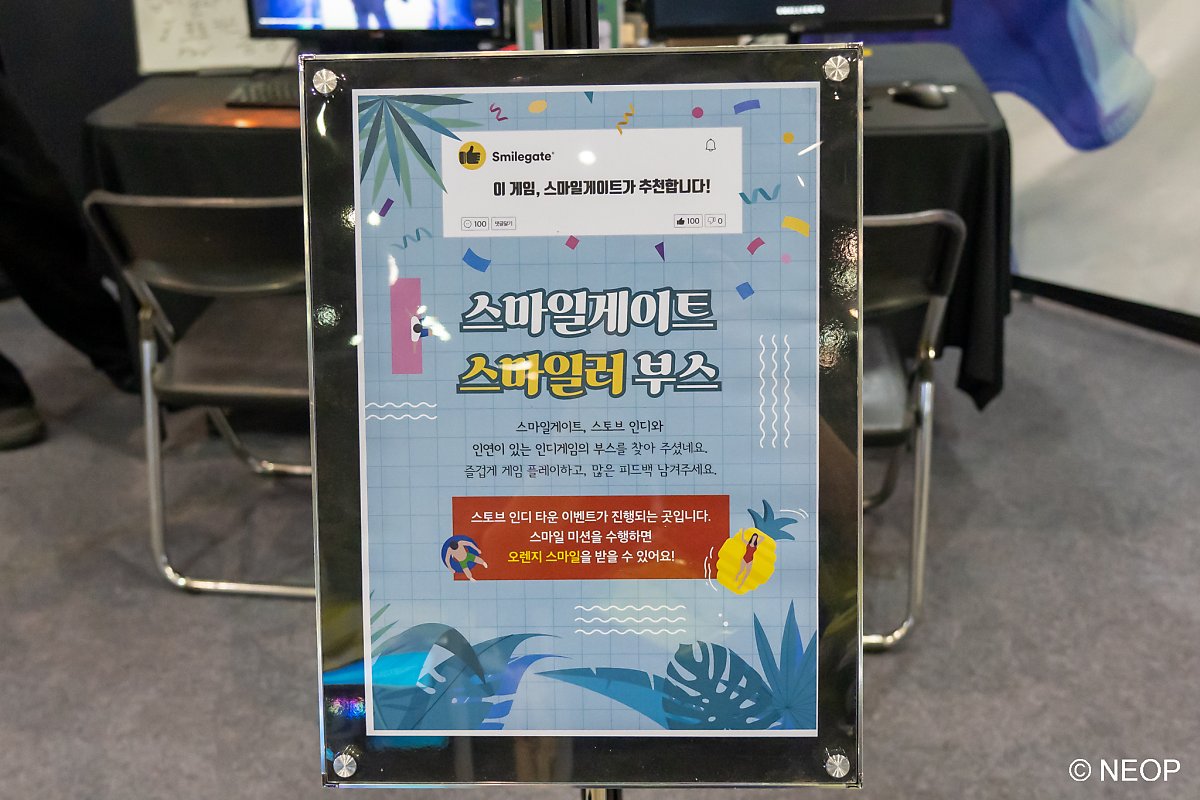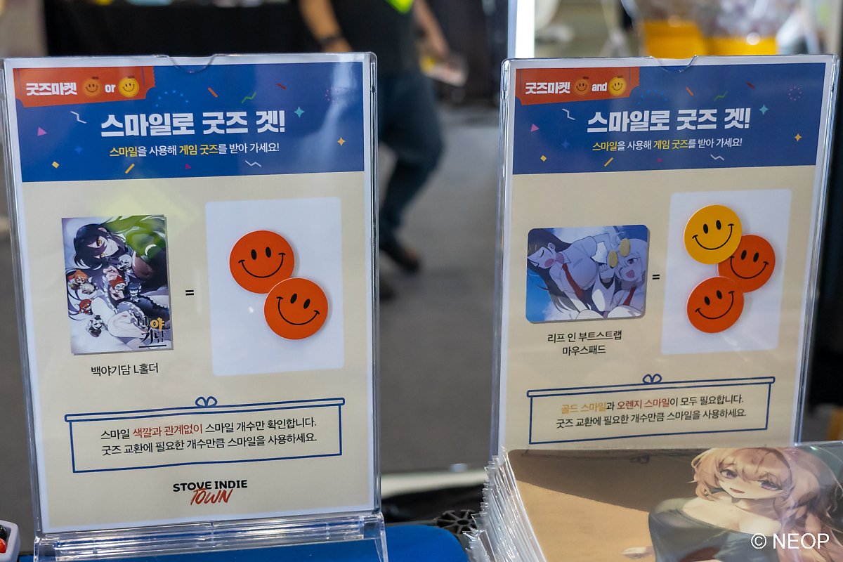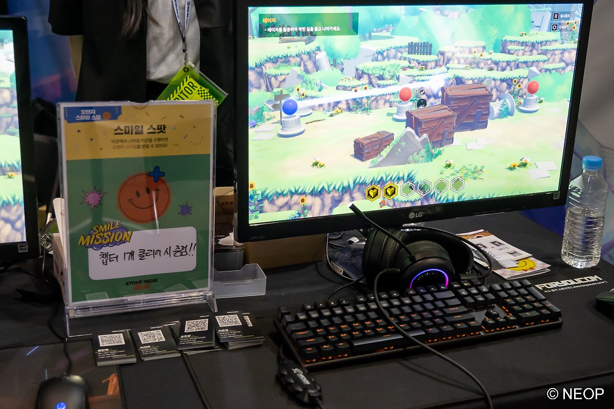 행사장을 돌아다녀 보면 '스마일러 부스' 표지판이 걸린 부스들이 있습니다. 여기에서 튜토리얼 완료, 챕터 1 클리어 등 미션을 완료하면 오렌지 스마일을 1개 받을 수 있어요.