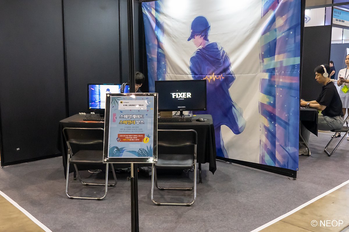 저는 우선 첫째 날인만큼 가볍게 골드 스마일 2개를 파밍한 다음, 오렌지 스마일을 파밍하기 위해 부스를 돌아다녔습니다. 가장 먼저 해본 게임은 FIXER. 컨셉 아트가 액션 게임 같아서 해봤는데 난이도가 제법 어려운 퍼즐 게임이더라고요. 퍼즐은 젬병이라서 울뻔했습니다.