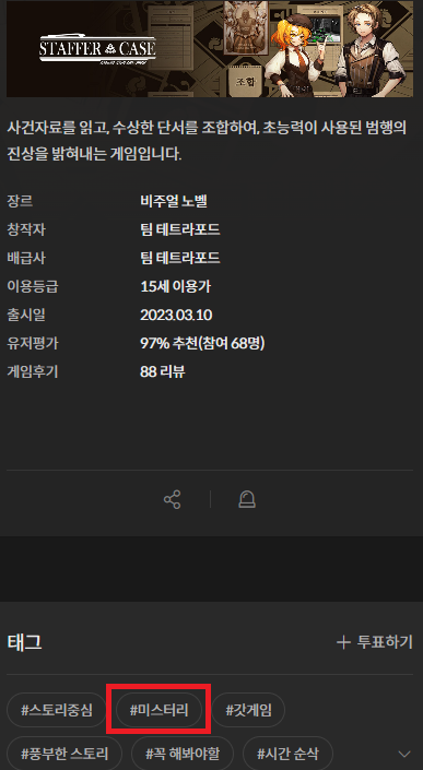 만약 그렇다면 31일의 빅딜은 스태퍼 케이스가 아닐까 생각이 드네요. 게임성이 좋은 비쥬얼 노벨이자 미스테리물이라 골라 봤습니다. 아예 비쥬얼 노벨이 아닌 공포 게임이 나올 수도 있을 것 같네요. 스태퍼 케이스는 미스테리물이긴 하지만 공포스러운 분위기는 아니니까요.