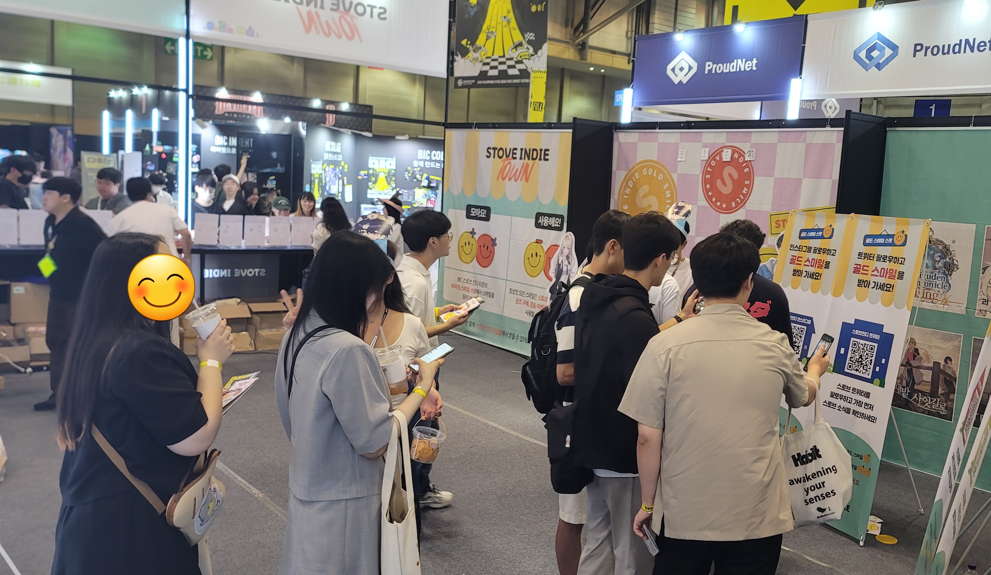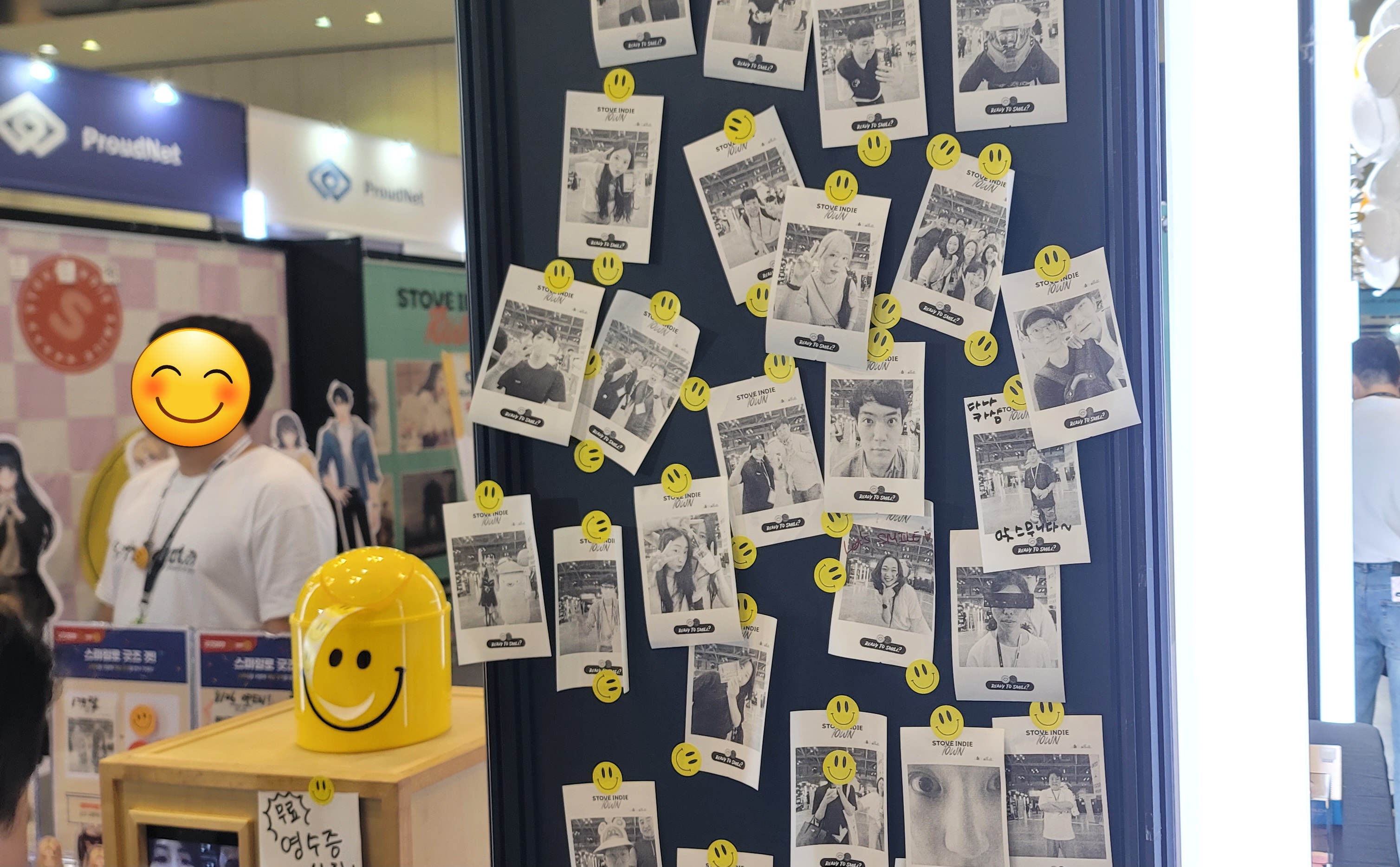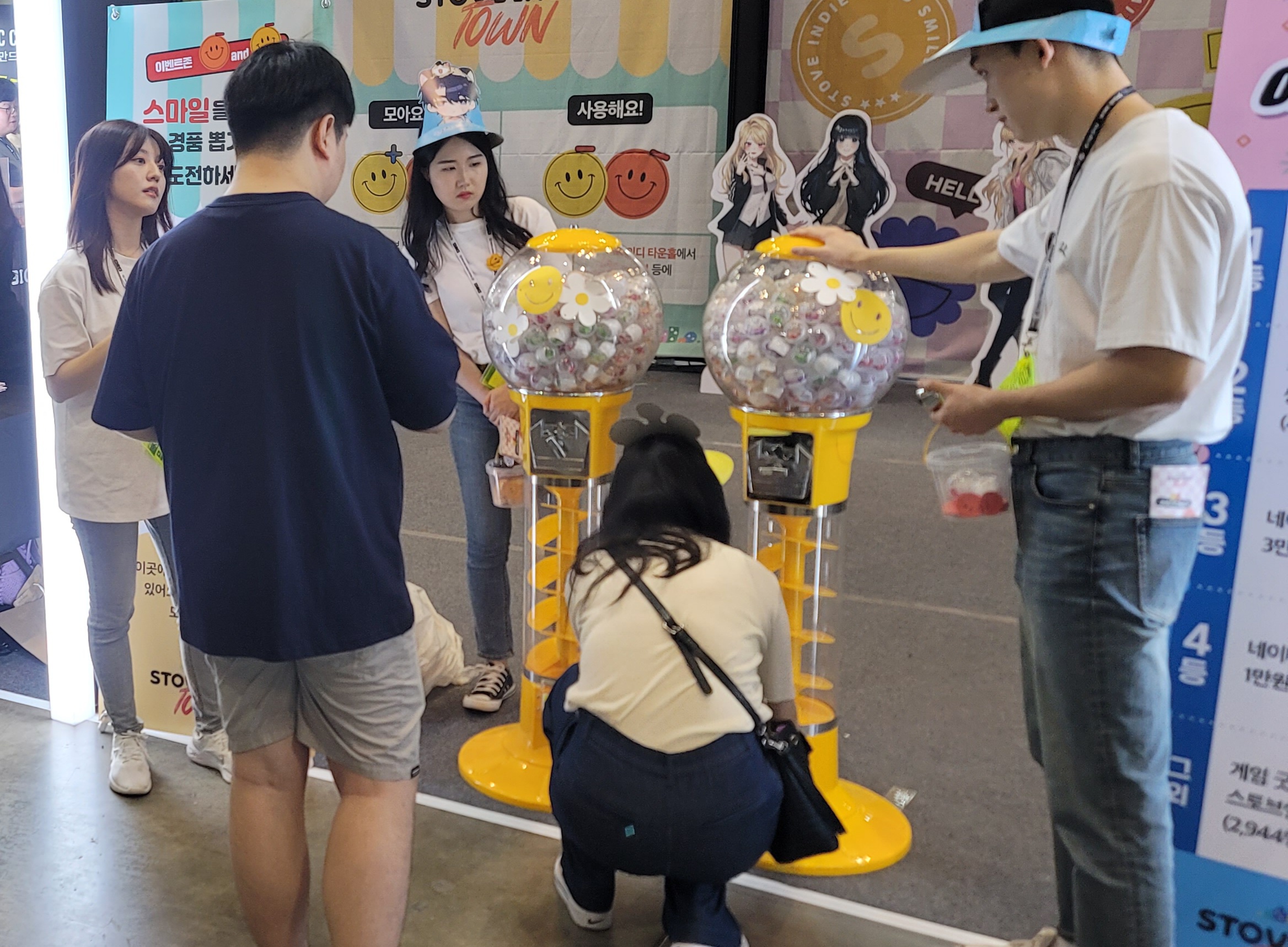 스토브인디 부스에서 골드 스마일, 스마일 스팟에서 오렌지 스마일을 모아오신 분들이 어떤 굿즈와 교환할까 고민 중이시네요
